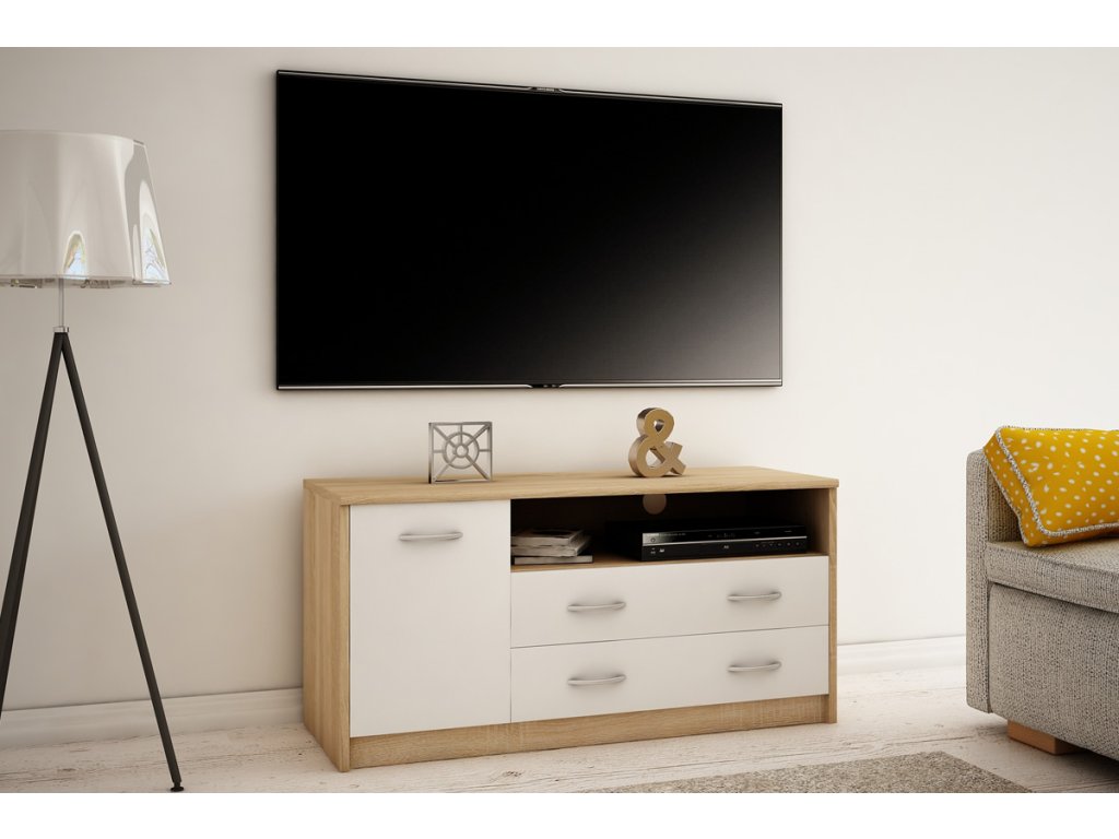 MAREK 027 TV stolek s policemi a zásuvkami, dub sonoma/bílá