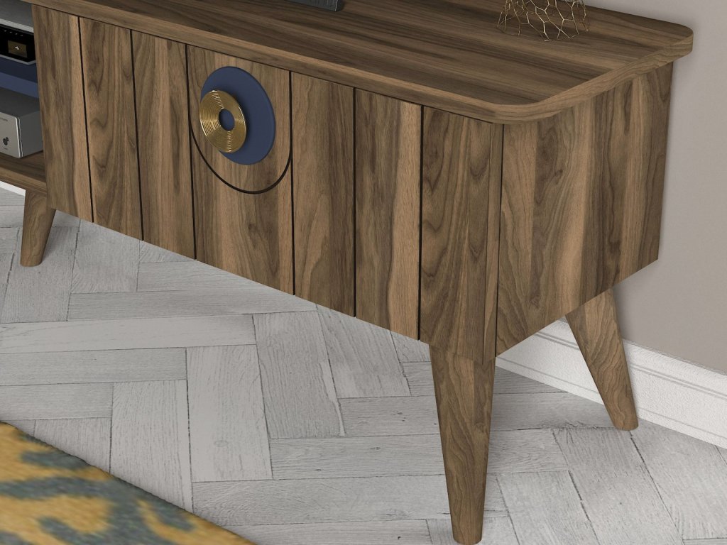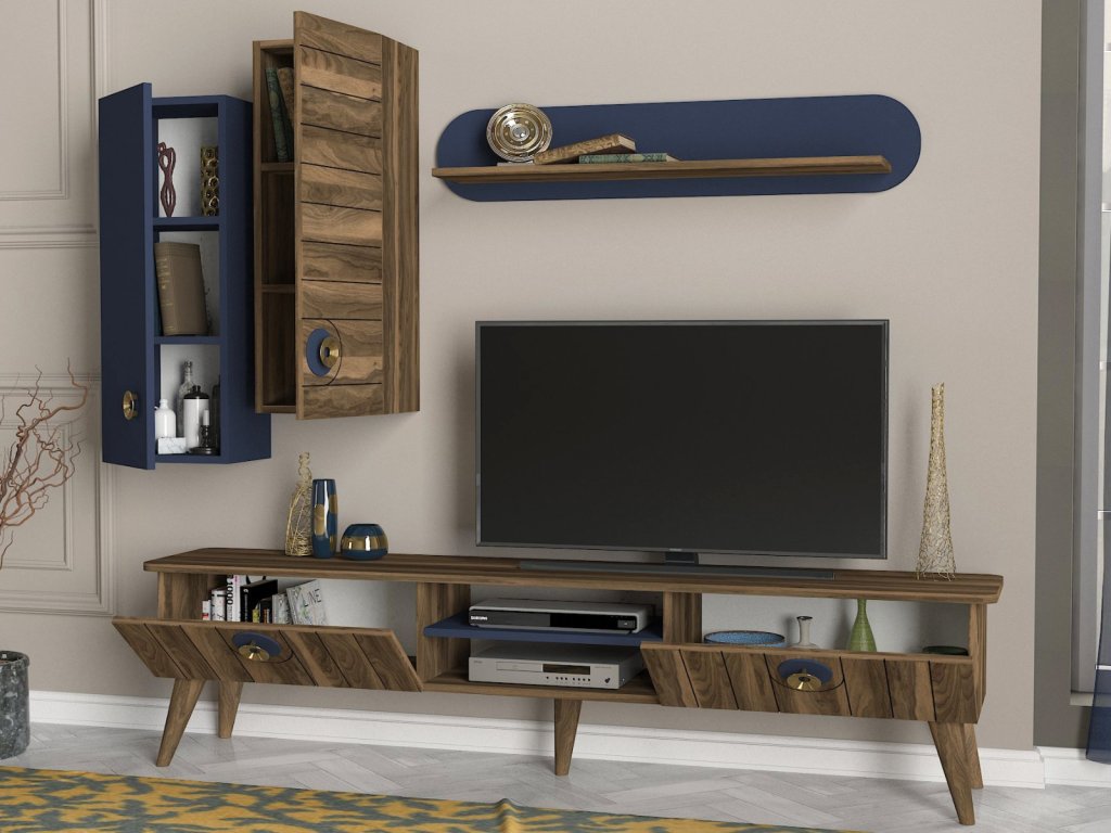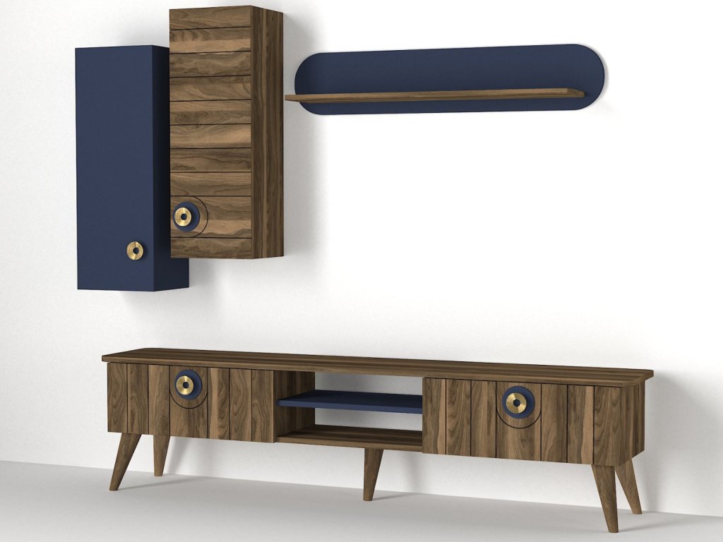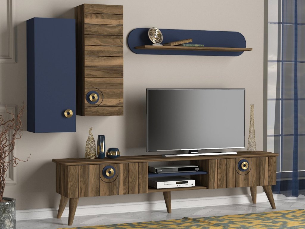 Designová malá TV stěna MARIETA vás díky svému netradičnímu provedení přenese do světa orientu a pohádek tisíc a jedné noci. Tento nábytek je charakteristický výraznou kresbou dřeva, která je doplněna orientálními prvky v modré barvě a zlatou barvou na úchytech. TV skříňka poskytuje dostatek úložného prostoru ve formě otevřených polic i zavřených skříněk. Zajímavé jsou také závěsné skříňky a police, které Vám poskytnou prostor pro vystavení dekorací či knih.