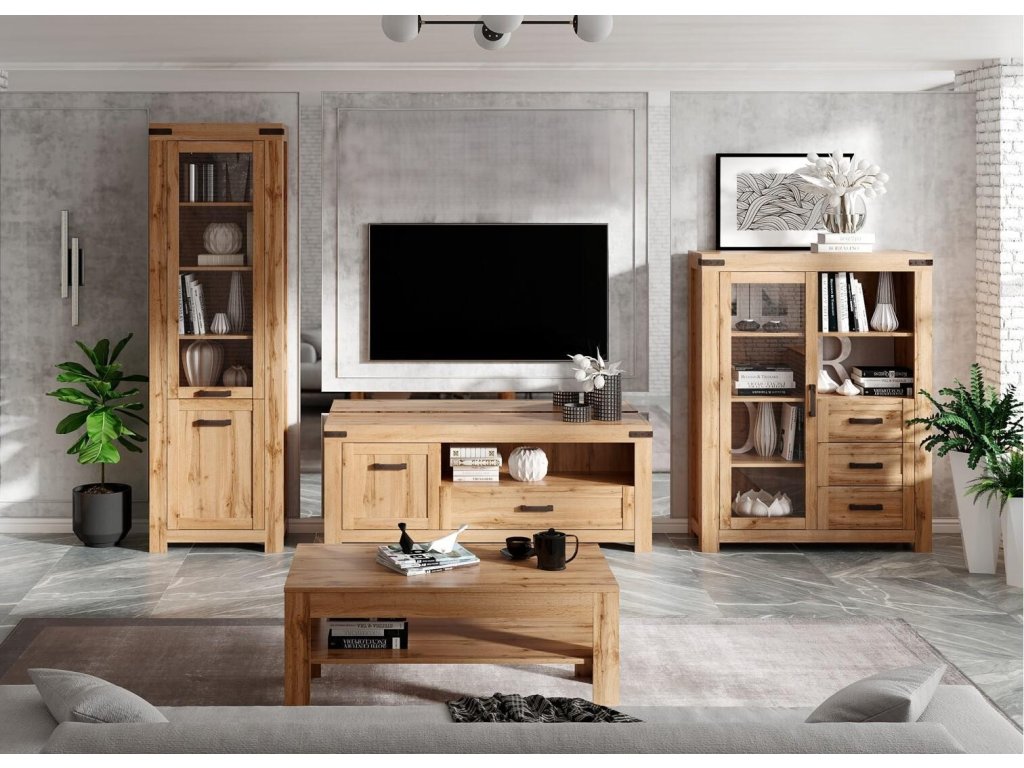 Obývací sestava MARIETTA v moderním designu je praktickým i designovým kouskem do vašeho obývacího pokoje. Nabízí bohatý úložný prostor v podobě dvou vitrín a TV stolku.