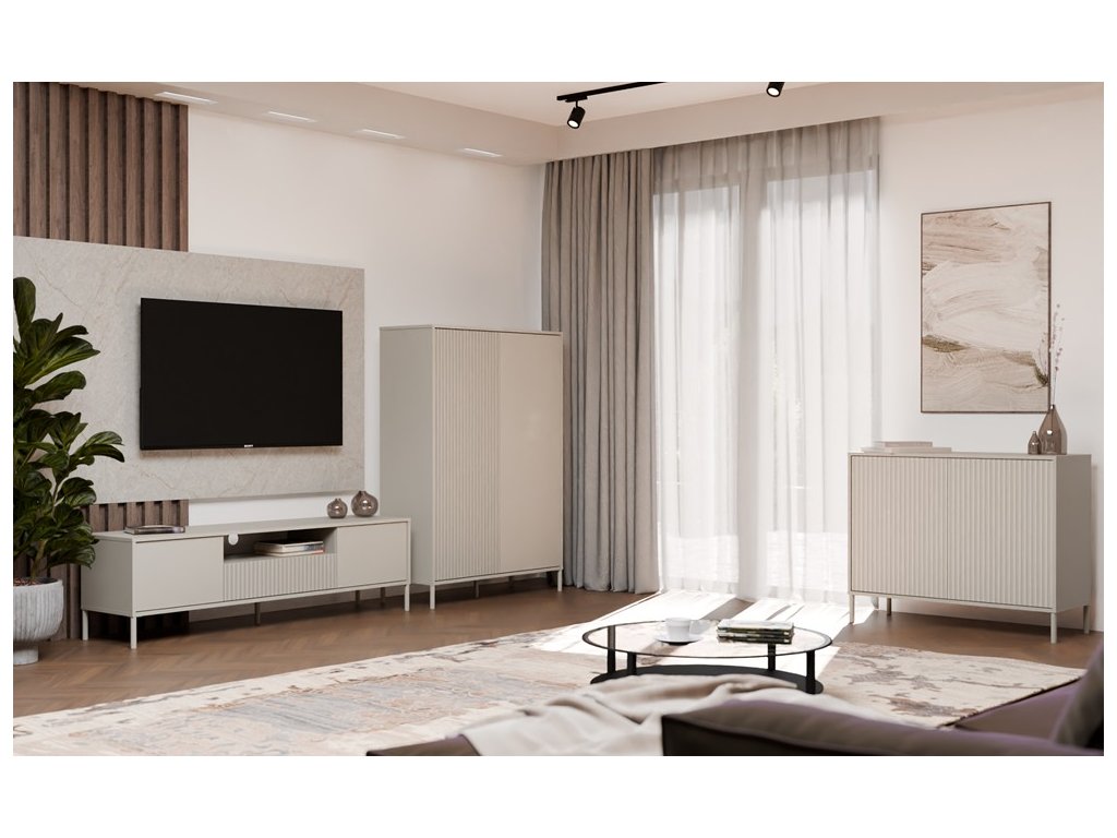 KAMARO čtyřdveřová skříňka 4DK je kombinací estetiky a funkčnosti, která se perfektně hodí do obývacího pokoje v jakémkoli stylu. Díky drážkovaným předním částem (připomínajícím lamely) získává nábytek moderní a originální vzhled, který dokonale ladí se současnými interiéry. Moderní systém TIP-ON umožňuje pohodlné používání bez úchytek – stačí jemně stlačit dvířka a skříňka se otevře. Čtyřdveřová skříňka nabízí velký úložný prostor a zároveň si zachovává minimalistický a elegantní charakter, který se hodí do mnoha aranžmá. Kombinace módního odstínu s moderním designem vytváří kus nábytku, který dodá vašemu interiéru jemnou eleganci, styl a pořádek.