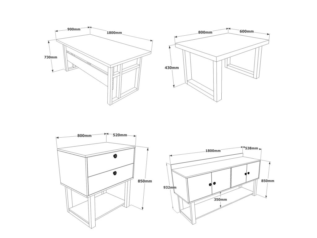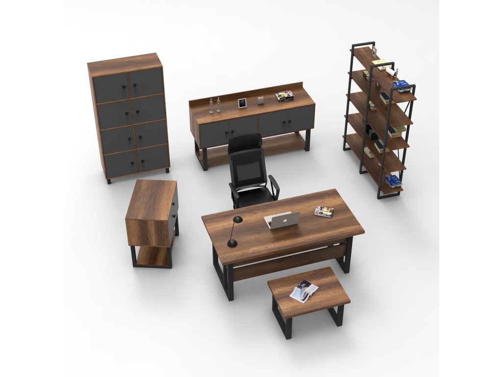 | Sestava obsahuje: | psací stůl 180x90x73cm, konferenční stolek 80x60x43cm, malá komoda 80x52x85cm, konzola 180x54x93cm, vysoká komoda 96x40x180cm, policový regál 155x34x3 |