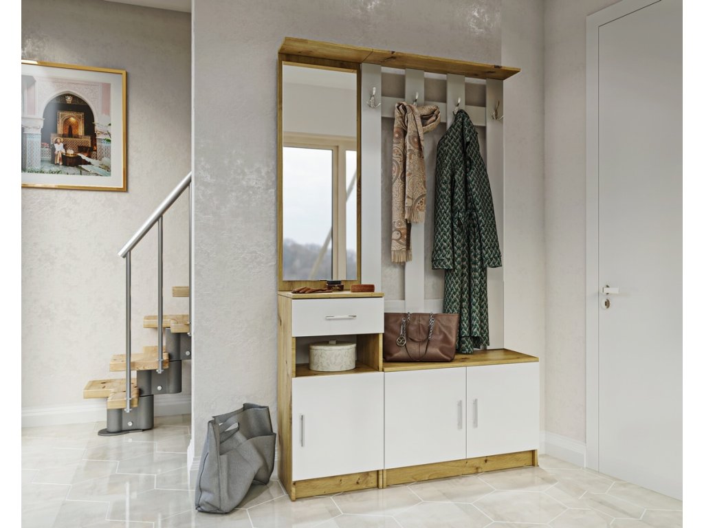 Prostorná sestava do předsíně MÁŠE poskytuje množství úložného prostoru, který ocení každý majitel. V nabídce je v barevném provedení bílá na dvířkách a dub Artisan odstínu na korpusu.