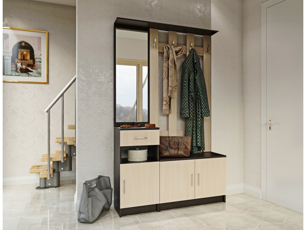 Prostorná sestava do předsíně MÁŠE poskytuje množství úložného prostoru, který ocení každý majitel. V nabídce je v barevném provedení dub mléčný na dvířkách a tmavém odstínu wenge na korpusu.