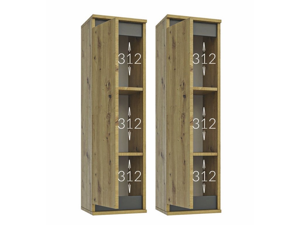 - 2x závěsná skříňka (v/š/h): 100,2 x 28 x 30,6 cm. Každá závěsná skříňka obsahuje dvě police.