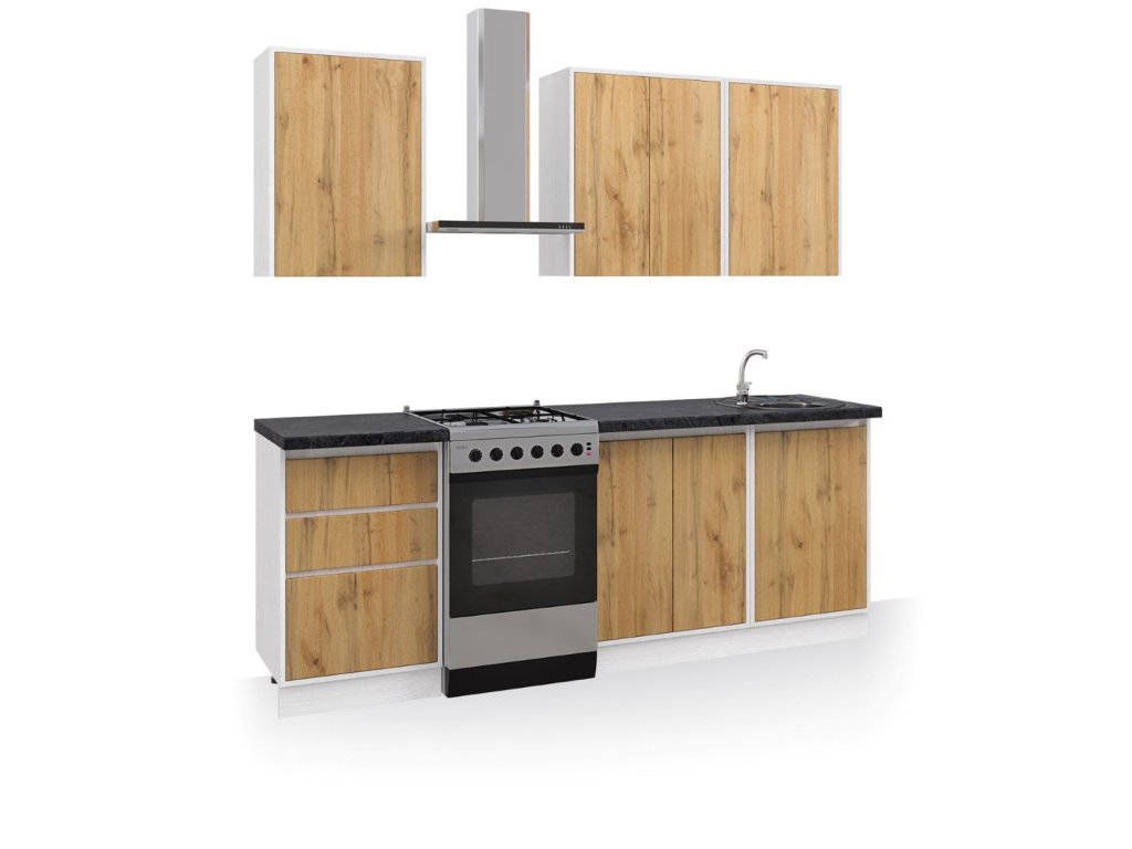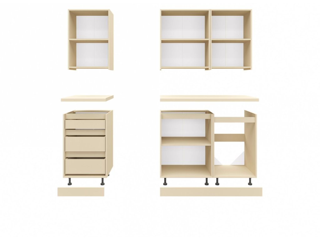 | Sestava obsahuje: | 2 ks horní jednodveřová skříňka 50 cm 1 ks horní dvoudveřová skříňka 60 cm 1 ks dolní skříňka se zásuvkami 50 cm 1 ks dolní dvoudveřová skříňka 60 cm 1 ks dolní jednodveřová dřezová skříňka 50 cm |
