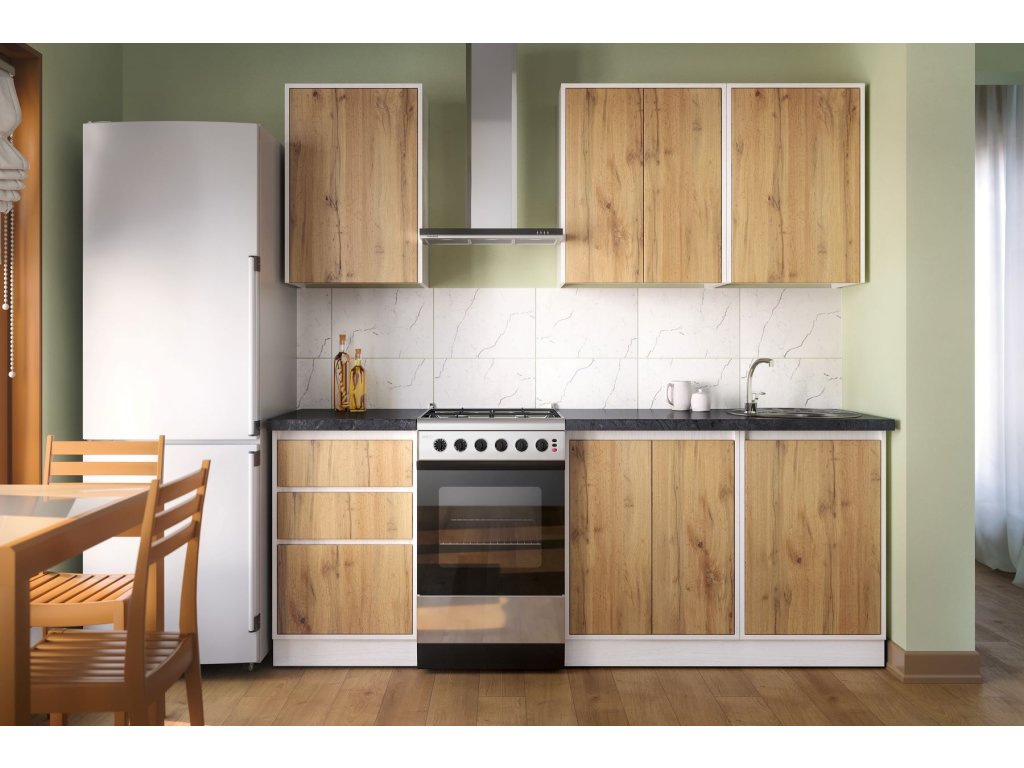 Kuchyňská linka MATEO 160 se vejde i do menších prostor. Kromě příjemného barevného provedení apalačský dub/bílá zaujme také bezúchytovým systémem otevírání.