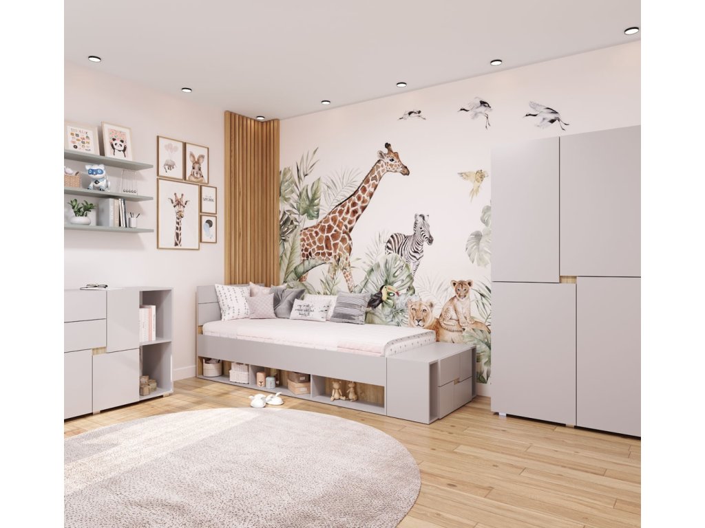 Díky široké nabídce prvků – komody, policová a šatní skříň, psací stůl, jednolůžková postel a noční stolek – si můžete vytvořit dokonalou sestavu do dětského nebo studentského pokoje podle vlastních představ.