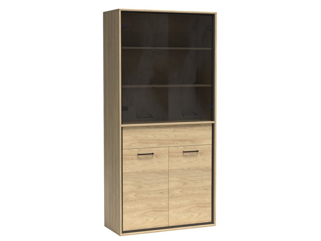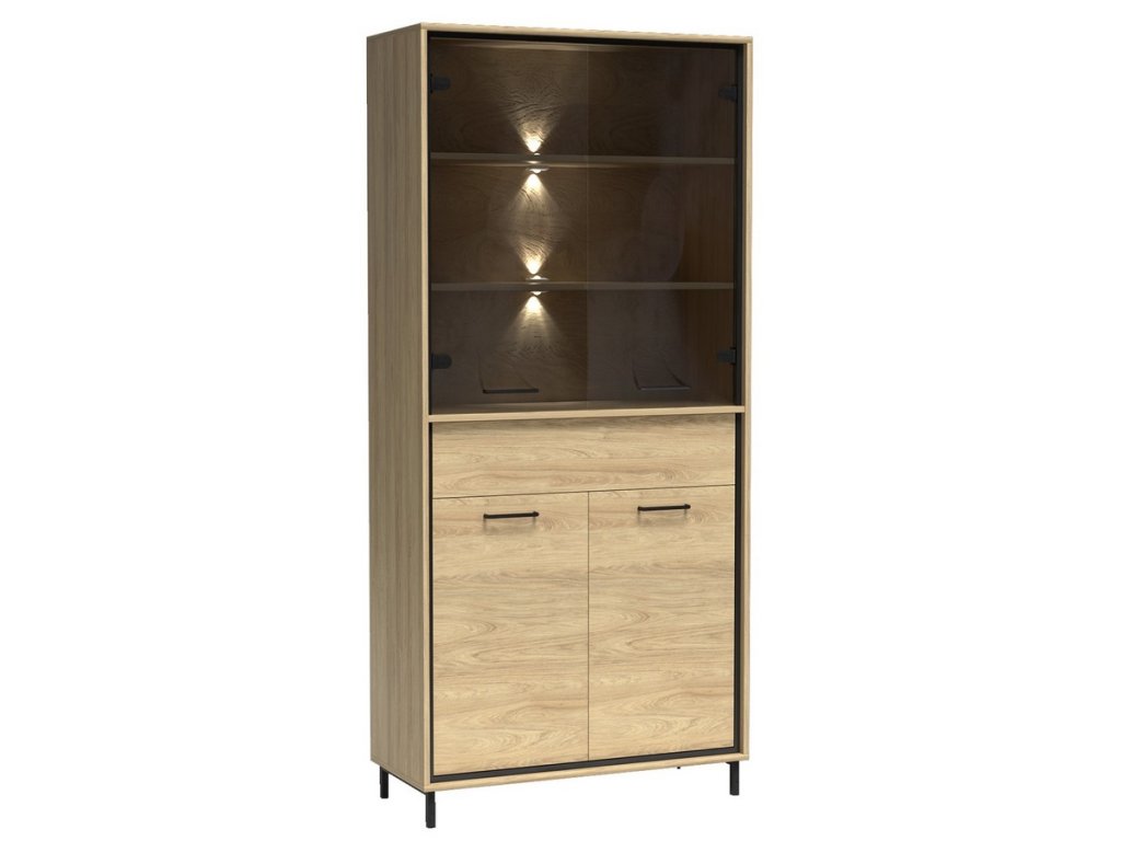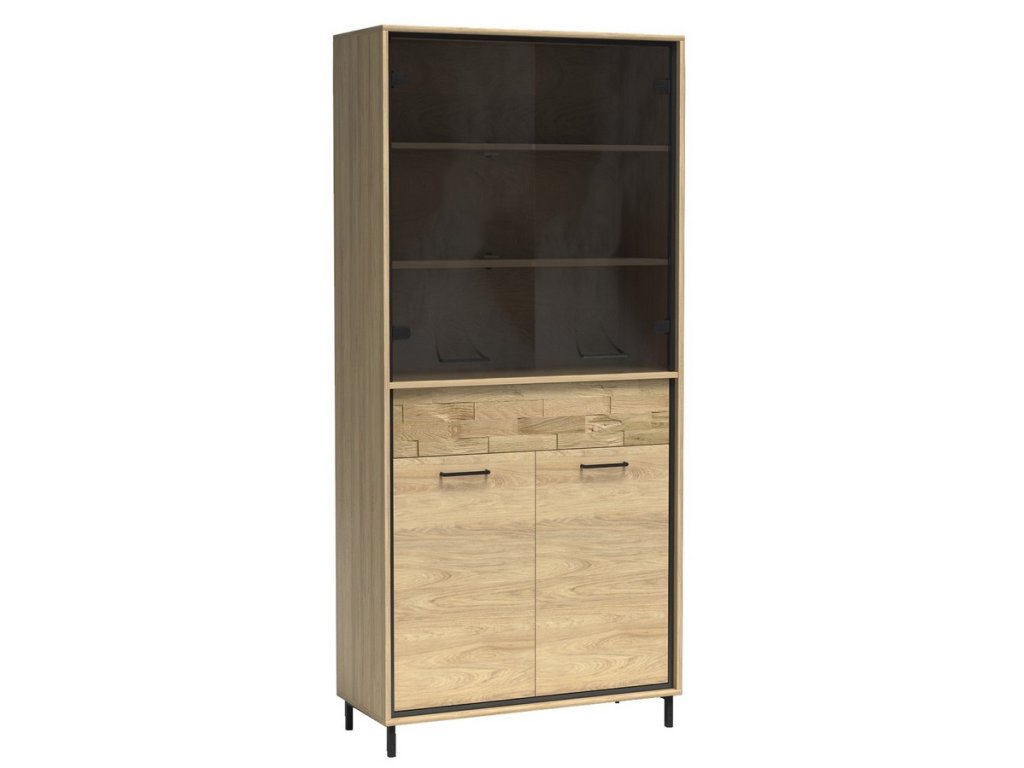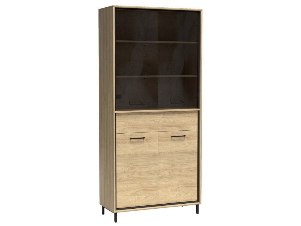 Vitrína čtyřdveřová se zásuvkou v industriálním stylu v barevném provedení dub hickory, doplněno prvky v černé barvě. Nábytek je vyroben z kvalitního lamina ohraničeného ABS páskou a také je vybaven systémem tichého dovírání. Zásuvka je doplněna dekorační dubovou deskou a systémem push to open - otvírání zmáčknutím zásuvky. Úchyty jsou černé kovové. Dále je možné dokoupit LED osvětlení vitríny a také LED dekorační pásek. Kolekce se skládá z mnoha prvků a tento široký výběr Vám zaručí sestavit si nábytek podle svých vlastních představ a přání. Dodáváme v demontovaném stavu.Doplňkové parametry