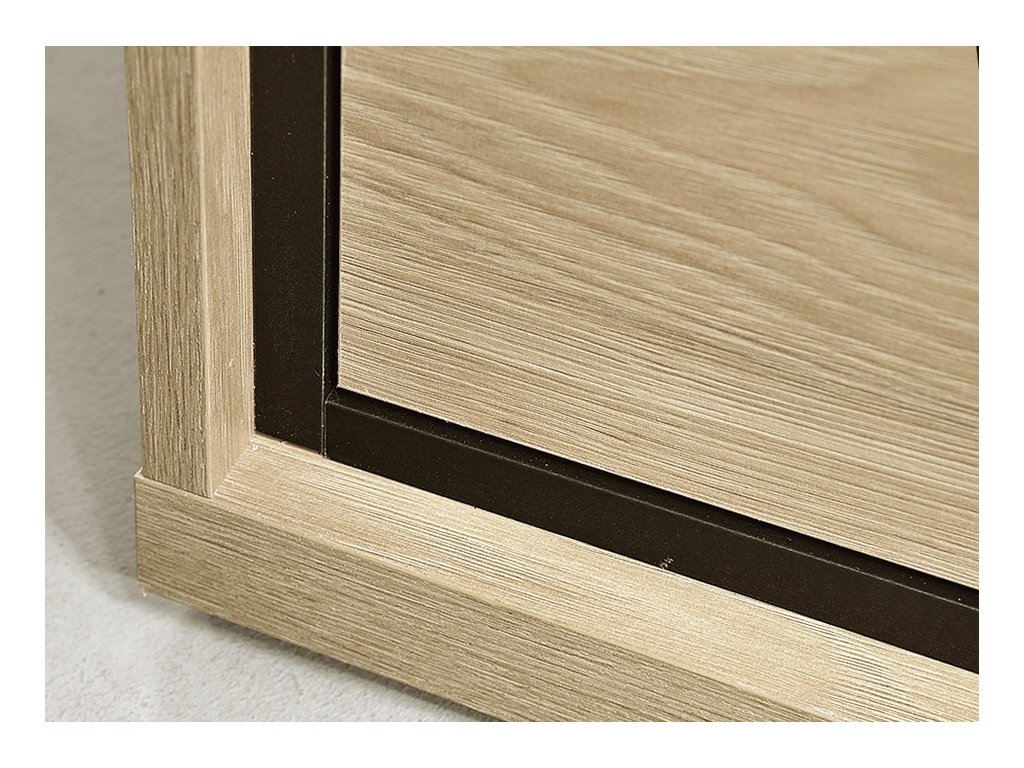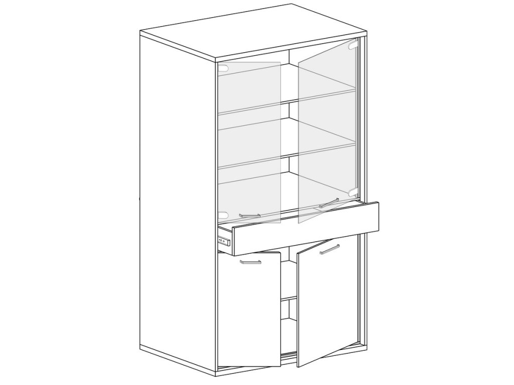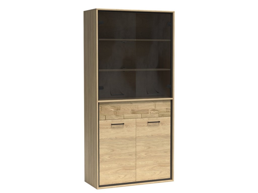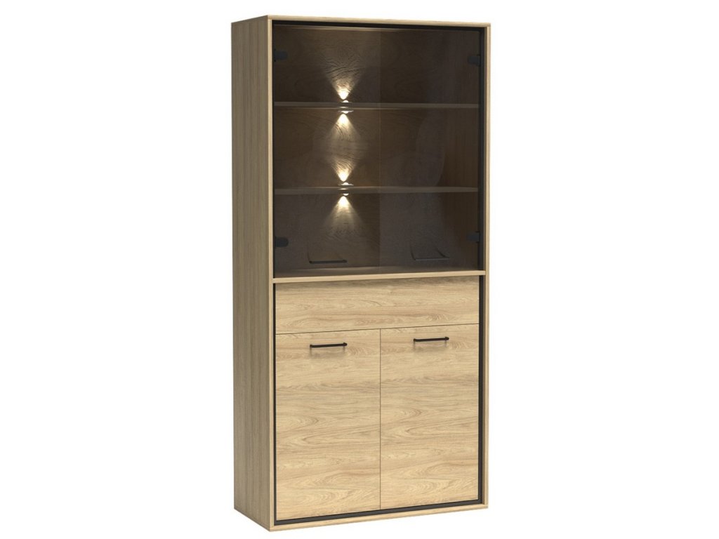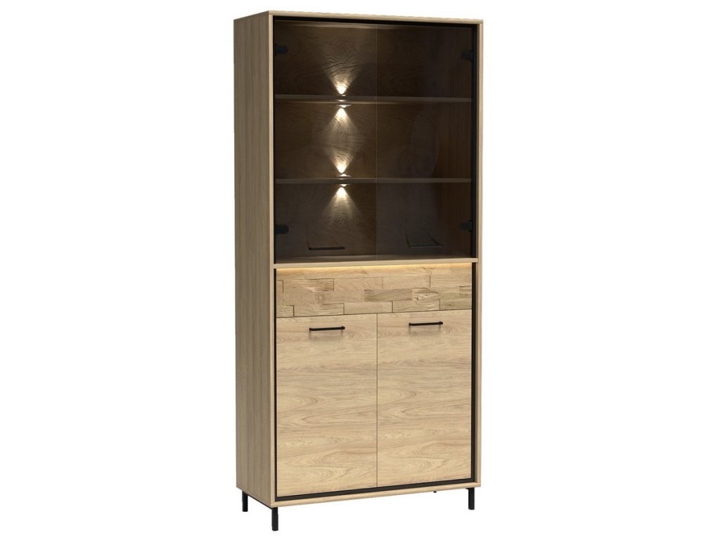 Vitrína čtyřdveřová se zásuvkou v industriálním stylu v barevném provedení dub hickory, doplněno prvky v černé barvě. Nábytek je vyroben z kvalitního lamina ohraničeného ABS páskou a také je vybaven systémem tichého dovírání. Zásuvka je doplněna dekorační dubovou deskou a systémem push to open - otvírání zmáčknutím zásuvky. Úchyty jsou černé kovové. Dále je možné dokoupit LED osvětlení vitríny a také LED dekorační pásek. Kolekce se skládá z mnoha prvků a tento široký výběr Vám zaručí sestavit si nábytek podle svých vlastních představ a přání. Dodáváme v demontovaném stavu.Doplňkové parametry