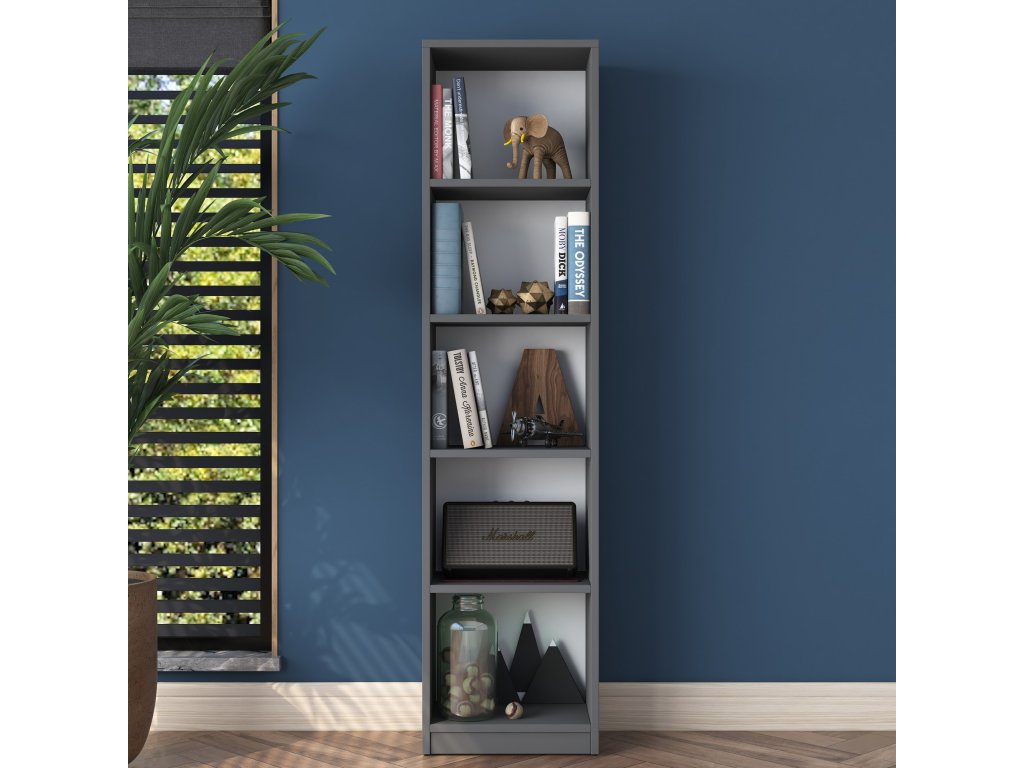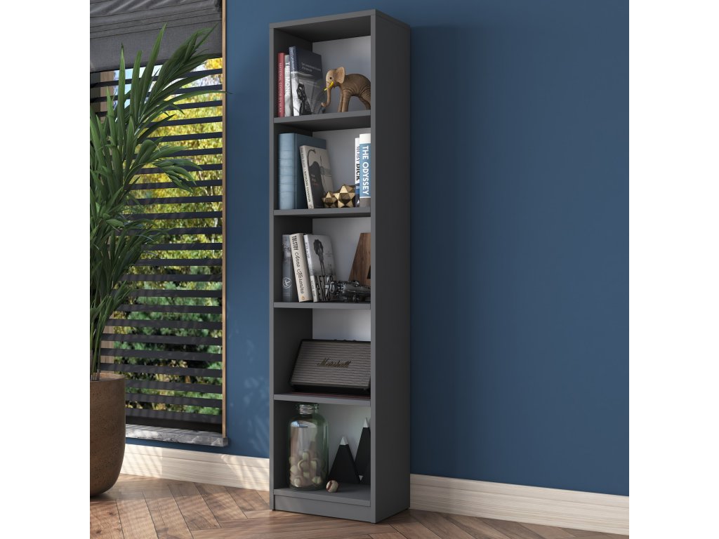 Knihovna MEGAN je ideální volbou pro všechny, kteří hledají praktický a elegantní kus nábytku do svého obývacího pokoje. Její úzký design a antracitová barva dodávají interiéru moderní a sofistikovaný vzhled. Nabízí dostatek prostoru na uspořádání knih, dekorací či dalších předmětů.