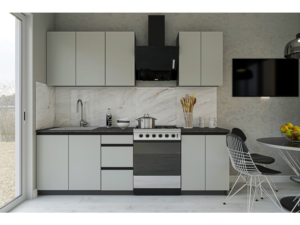 Kuchyňské skříňky jsou vyrobeny z kvalitních LTD desek. Jejich údržba je nenáročná. Korpus je v barvě grafitu. Dvířka jsou v barvě chinchila grey. Mají integrované úchyty typu GOLA.