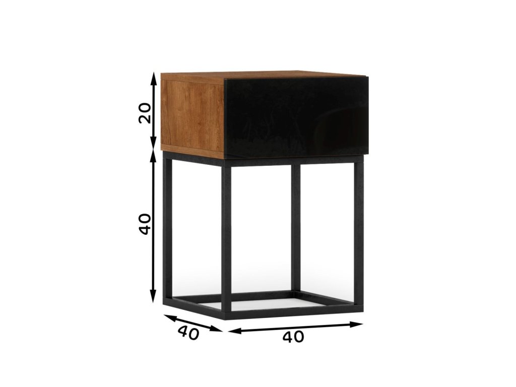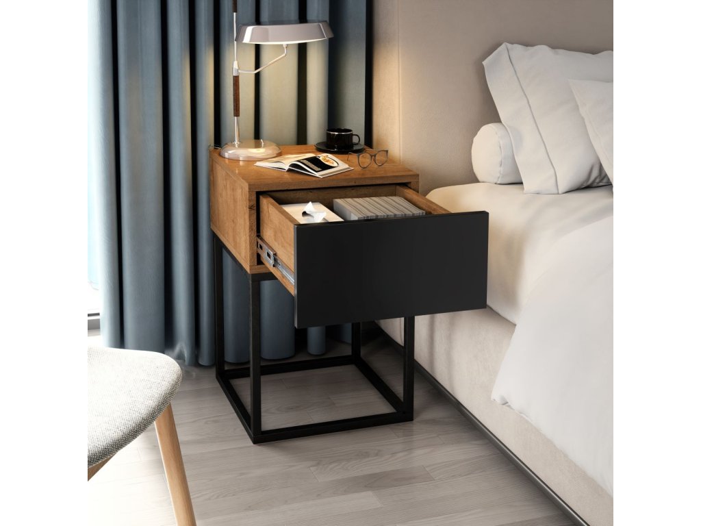 Noční stolek METAL s jednou zásuvkou, je ideálním místem pro časopisy nebo noční lampu. Jeho minimalistické rozměry: 40 x 60 x 40 cm vám umožňují vložit jej i do úzkých a úzkých rohů. Vrchní deska nábytku je vyrobena z MDF desky a potažena laminátem. Hrubé, kovové, černé nohy dělají noční stolek METAL velmi stabilním a odolným. Barevné provedení dub artisan v kombinaci s bílým nebo černým leskem.