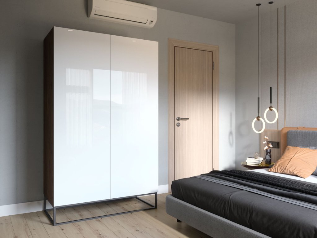 Dvoudveřová šatní skříň má bohatý úložný prostor, protože uvnitř je tyč na ramínka a prostor nad ním je chytře využit k vytvoření další police.