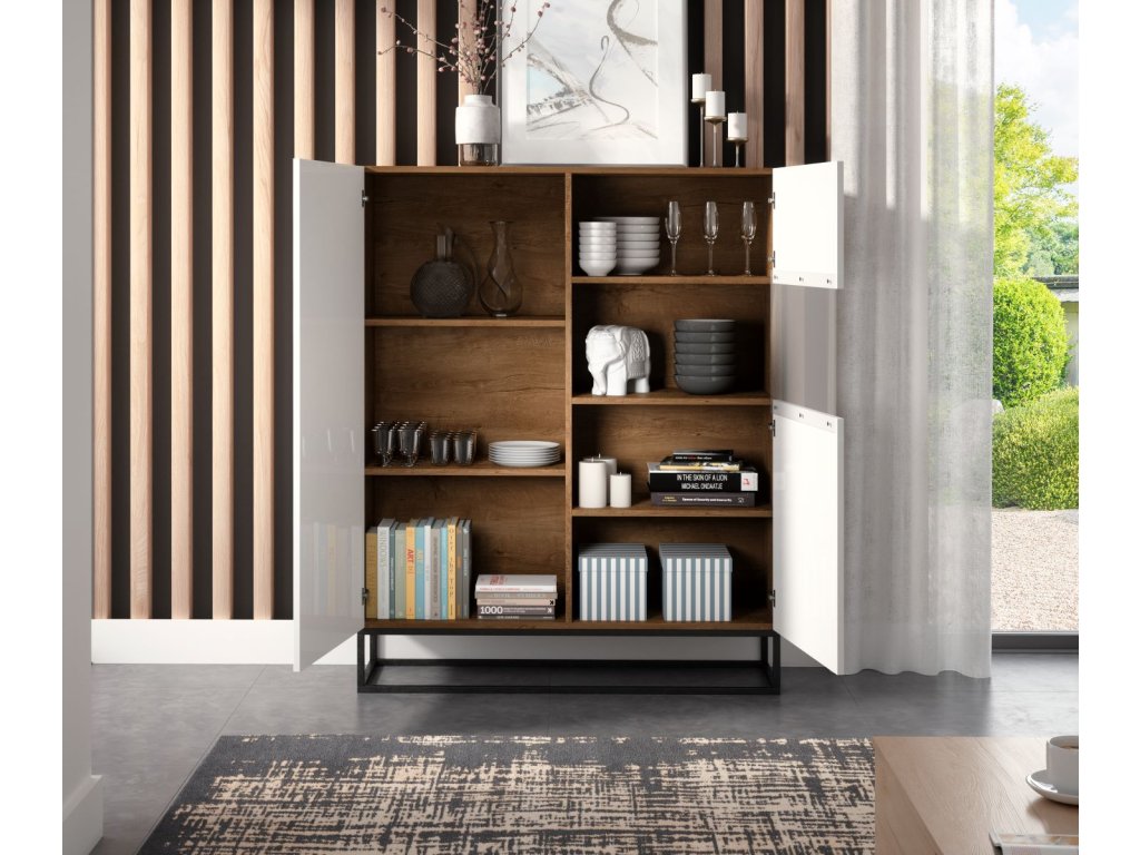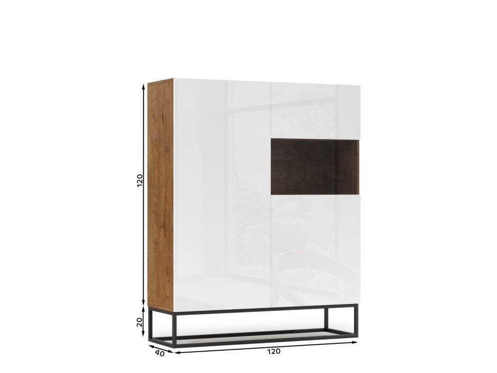 Vitrína z kolekce nábytku METAL je moderní, oku lahodící a funkční kus nábytku. Materiály použité při výrobě vitríny jsou MDF desky, které se vyznačují vysokou odolností. Chybějící úchyty na otevírání dvířek jsou jistě lahůdkou pro milovníky minimalismu. Místo toho má vitrína zabudované panty s funkcí „push to open“. Barevné provedení nábytku je v kombinaci dub artisan s bílými čely.