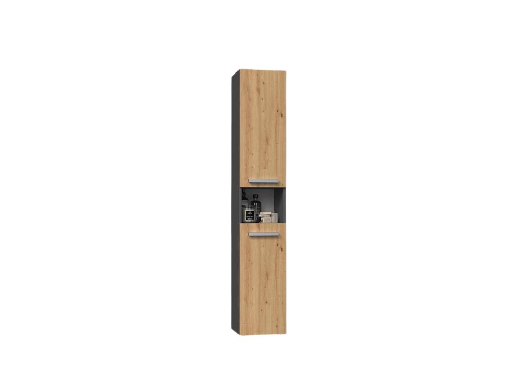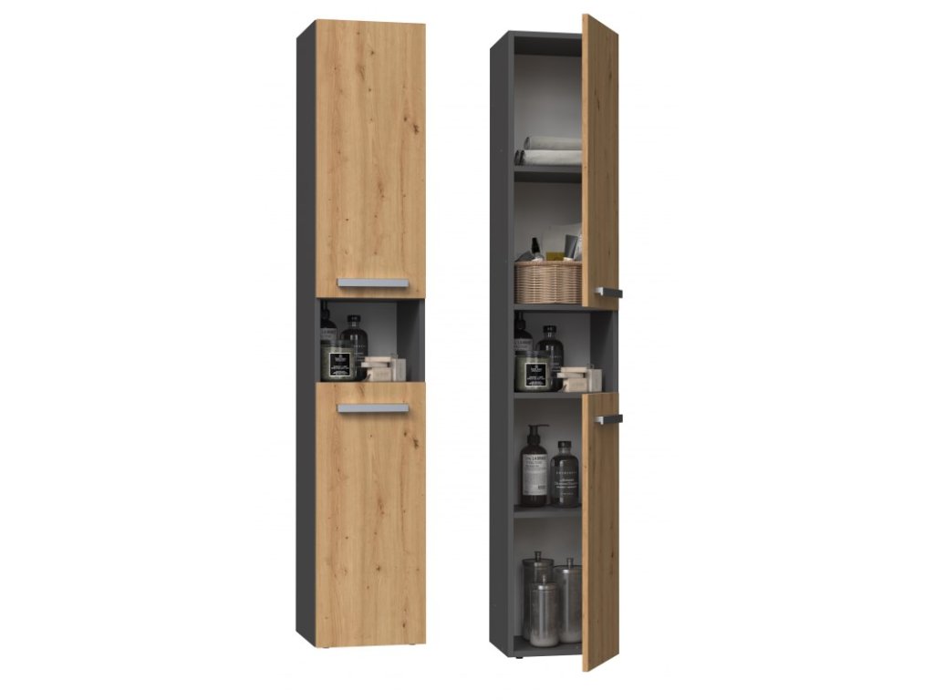 Skříňka do koupelny MIA I Vám poskytne dostatečný úložný prostor pro všechny koupelnové doplňky. Je vyrobena z kvalitní LTD desky v moderním barevném provedení antracit/ dub artisan a hrany má chráněno ABS páskou. Uvnitř skříňky je nacházejí praktické police. Úchyty jsou plastové ve stříbrné barvě.
