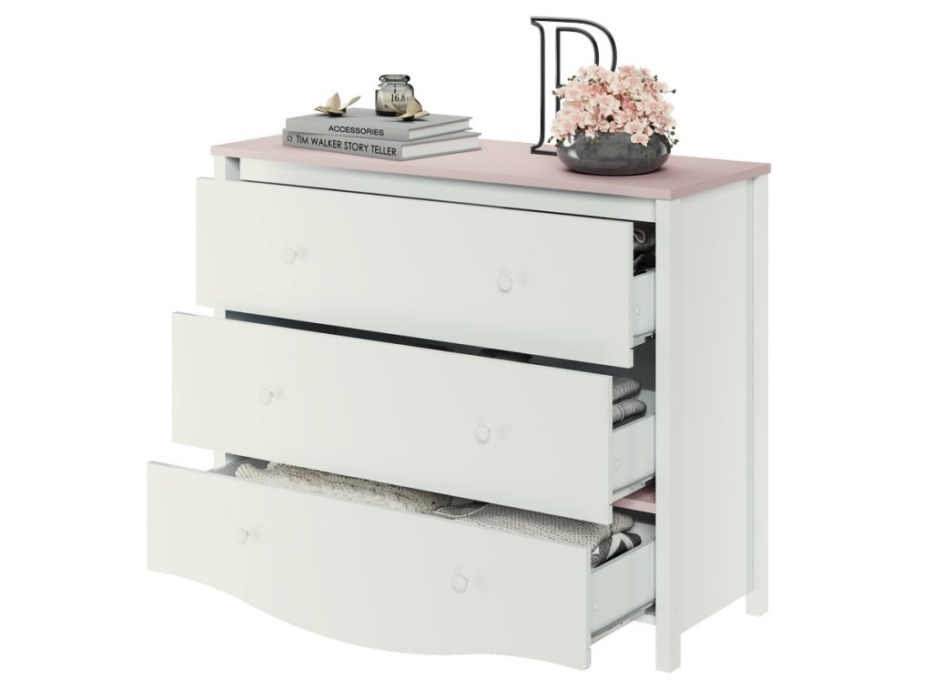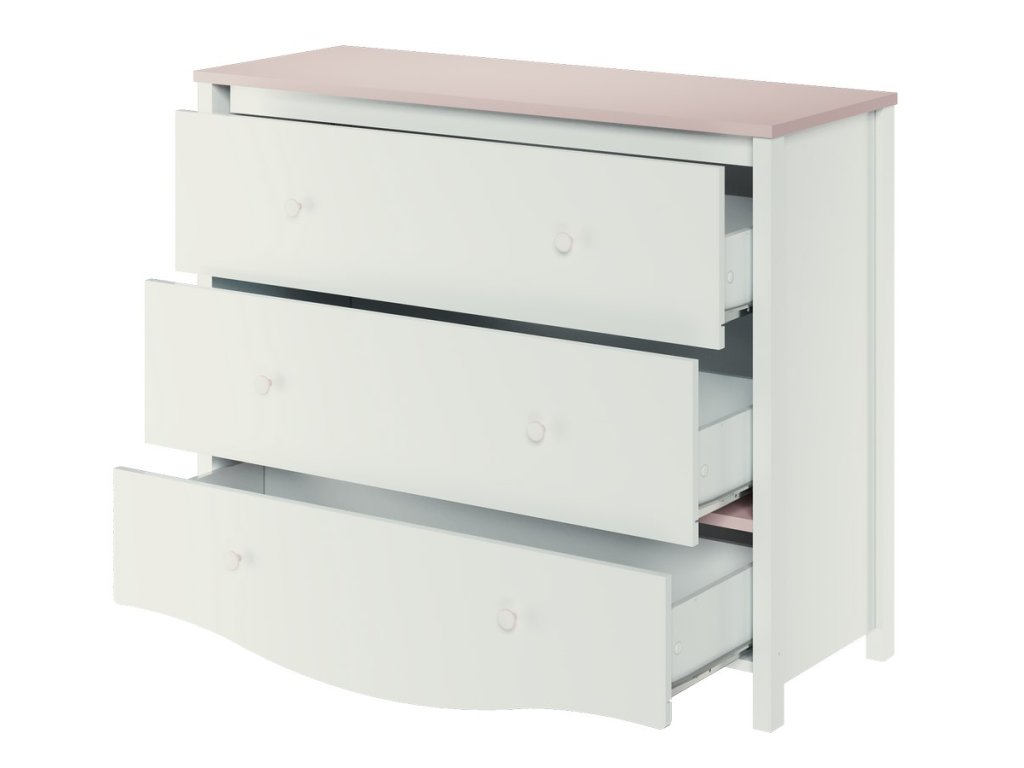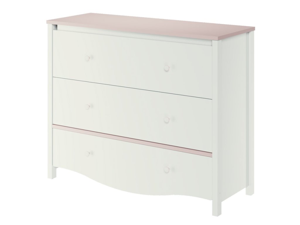 Komoda MI-16. Komoda má 3 zásuvky. Nábytek je vyrobený z kvalitního lamina ohraničené ABS páskou, dolní část velké zásuvky je vyřezaná do obloučku. Komoda je v barvě bílé a růžové. V naší nabídce najdete mnoho dalších prvků této sestavy a tento široký výběr Vám zaručí sestavit si útulný dětský pokoj. Dodáváme v demontovaném stavu.