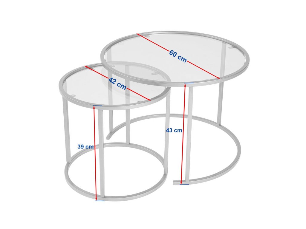 Malý stůl měří 42 cm na šířku, 39 cm na výšku a 42 cm do hloubky, zatímco velký stůl měří 60 cm na šířku, 43 cm na výšku a 60 cm do hloubky. Tato všestranná sada má ideální velikost pro každý obývací pokoj a poskytuje dostatek prostoru pro nápoje, občerstvení a dekorace.