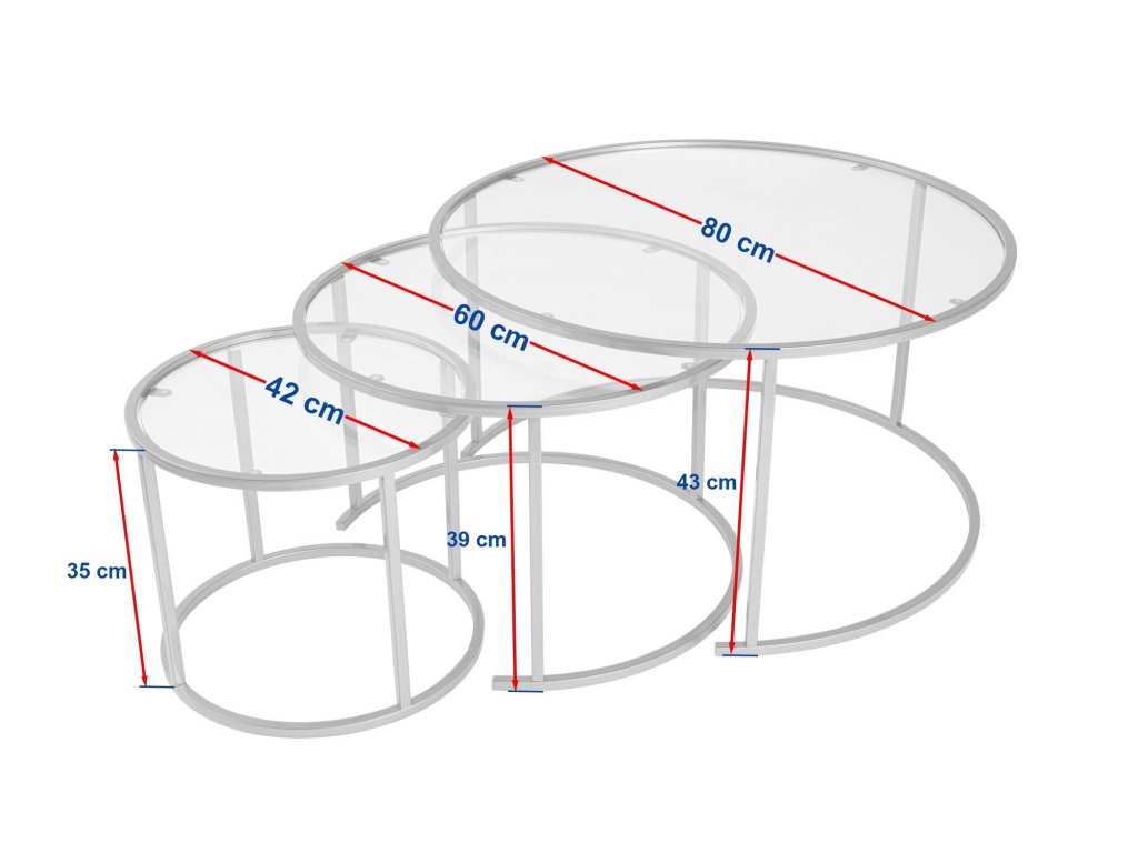 - Střední stůl: Šířka: 60 cm, Výška: 39 cm, Hloubka: 60 cm