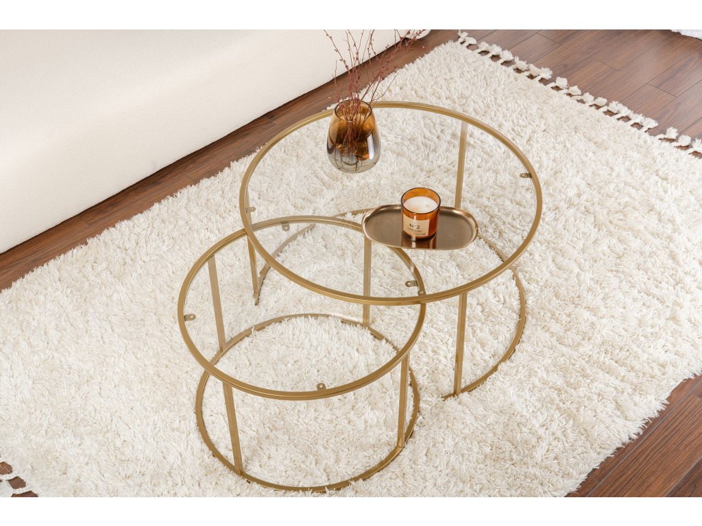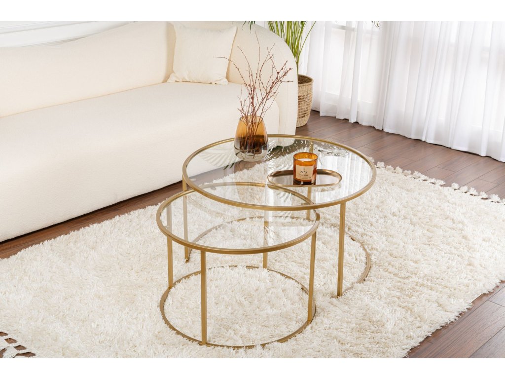 Kombinace průhledného skla a zlatých akcentů vytváří luxusní a moderní vzhled, který vylepší jakýkoli obývací pokoj. Elegantní linie a minimalistický design dělají z této sady konferenčních stolků perfektní doplněk do moderních a elegantních interiérů.