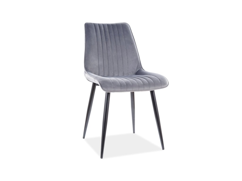Konstrukce židle je kovová v černé barvě. Sedák s opěrkou jsou čalouněny šedou sametovou látkou velmi příjemnou na dotek. Samet dodává židli nádech luxusu. Navíc má židle sedák s tlustší vrstvou výstelky a tvarovanou opěrku, což zvyšuje pohodlí při sezení. V nabídce iv dalších barvách.