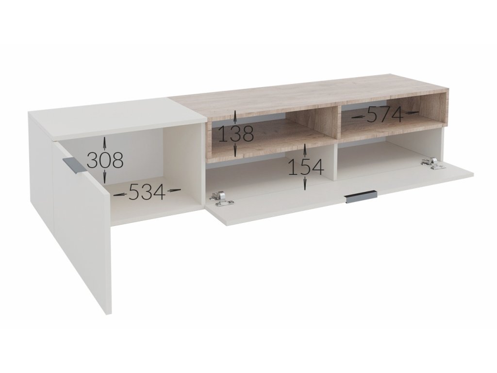 Své uplatnění najde jak v malých obývácích, tak ve velkých prostorách, kde ponechá vzdušnost a prostornost. Díky stylovému barevnému provedení se stane unikátní ozdobou Vaší domácnosti. Spodní část sestavy tvoří TV stolek, na kterém najde své místo TV přijímač a další potřebná technika. Jeho součástí jsou také 2 uzavřené prostory. Rozměry (š/v/h): 175 x 35 x 39 cm.