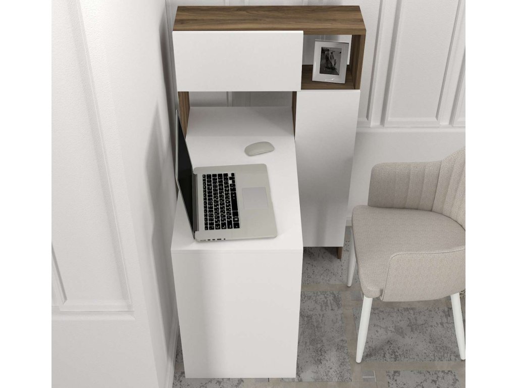 Písací stůl MILA je vyroben z kvalitního LTD materiálu s tloušťkou 18 mm, což zajišťuje jeho pevnost a dlouhou životnost. Elegantní kombinace bílé a ořechové barvy dodává stolu moderní a stylový vzhled, který se hodí do jakéhokoliv interiéru. Stůl je vybaven praktickým regálkem, který poskytuje dostatek úložného prostoru pro vaše pracovní potřeby a pomůcky.