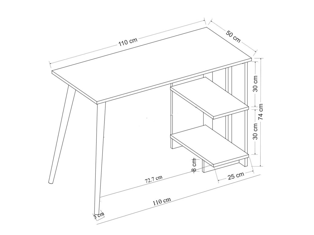 S rozměry 74 x 110 x 50 cm poskytuje dostatek prostoru pro pohodlnou práci či studium. Regálek integrovaný do konstrukce nabízí praktické úložné místo pro dokumenty, knihy nebo školní pomůcky.
