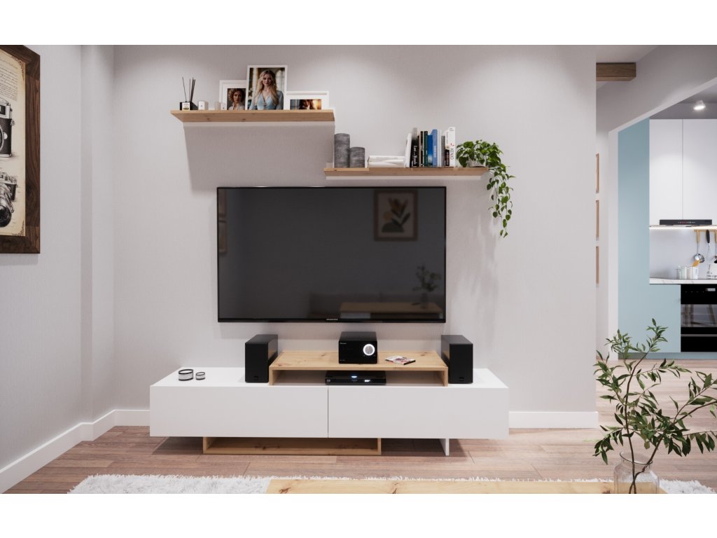 - Dostatečný úložný prostor: Otevřené police poskytují dostatek místa pro vaše knihy, dekorativní předměty a mediální zařízení.