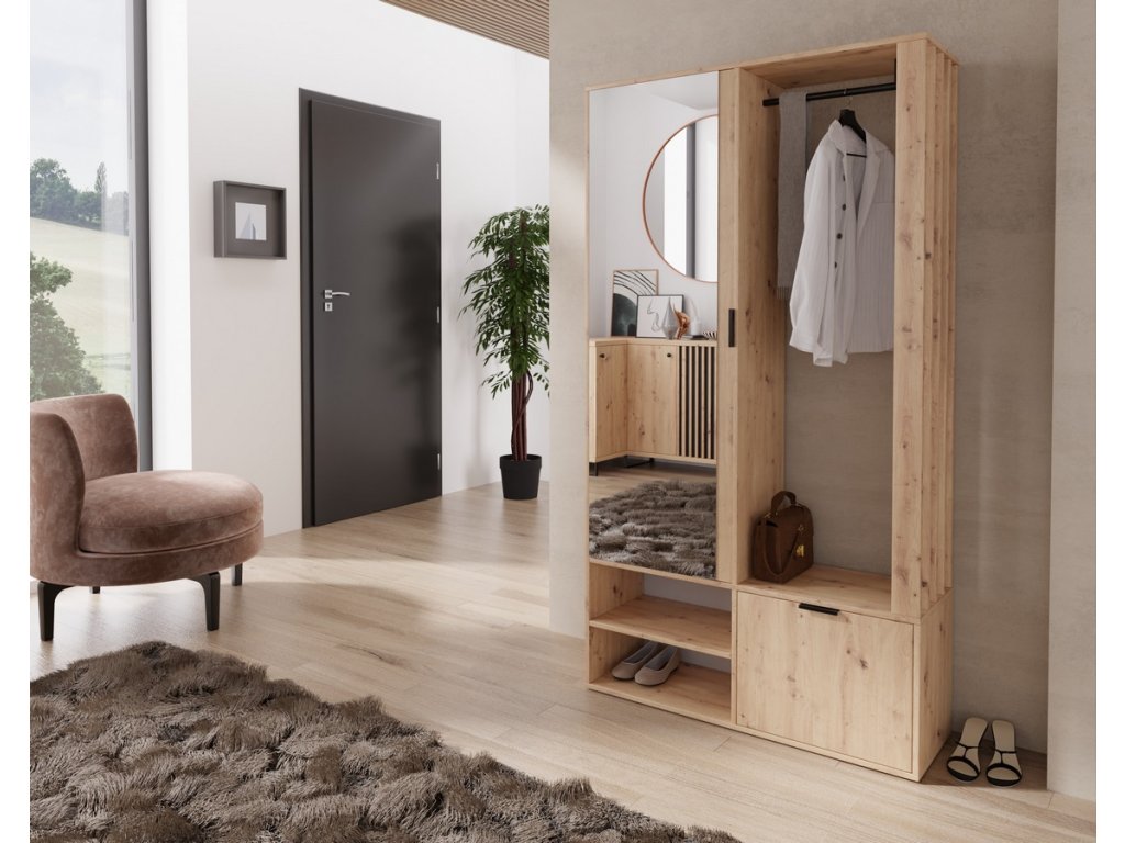 Moderní předsíňová stěna, vyrobená z kvalitní laminátové desky 16 mm v barvě dub artisan. Boční strana předsíně je tvořena z lamel v barvě dub artisan. Sestava se skládá z věšákového panelu, botníku a skříně se zrcadlem. Předsíň je univerzální, dá se složit na obě strany. Dodáváme v demontovaném stavu.