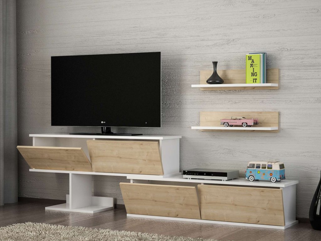 Představujeme MINIMUS, obývací stěnu, která kombinuje moderní design a funkčnost, aby přinesla do vašeho obývacího pokoje svěžest a eleganci. Tato stylová sestava v kombinaci bílé a světle hnědé barvy je navržena tak, aby poskytovala praktické a estetické řešení pro vaše multimediální zařízení a další potřeby.