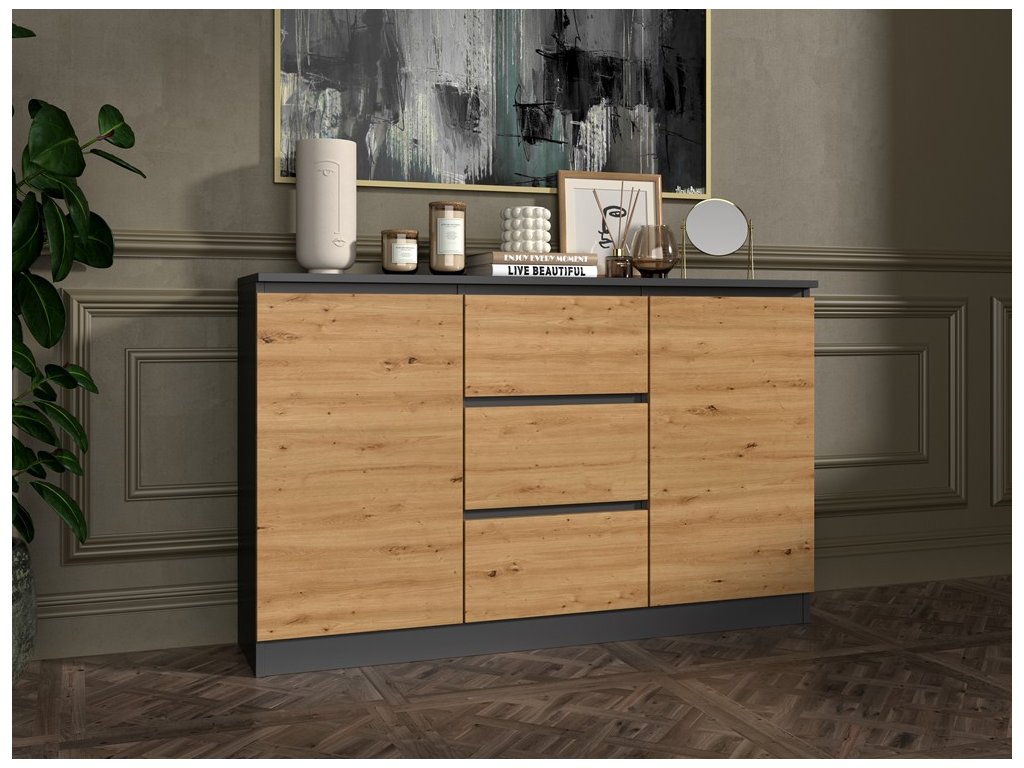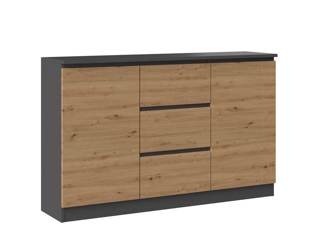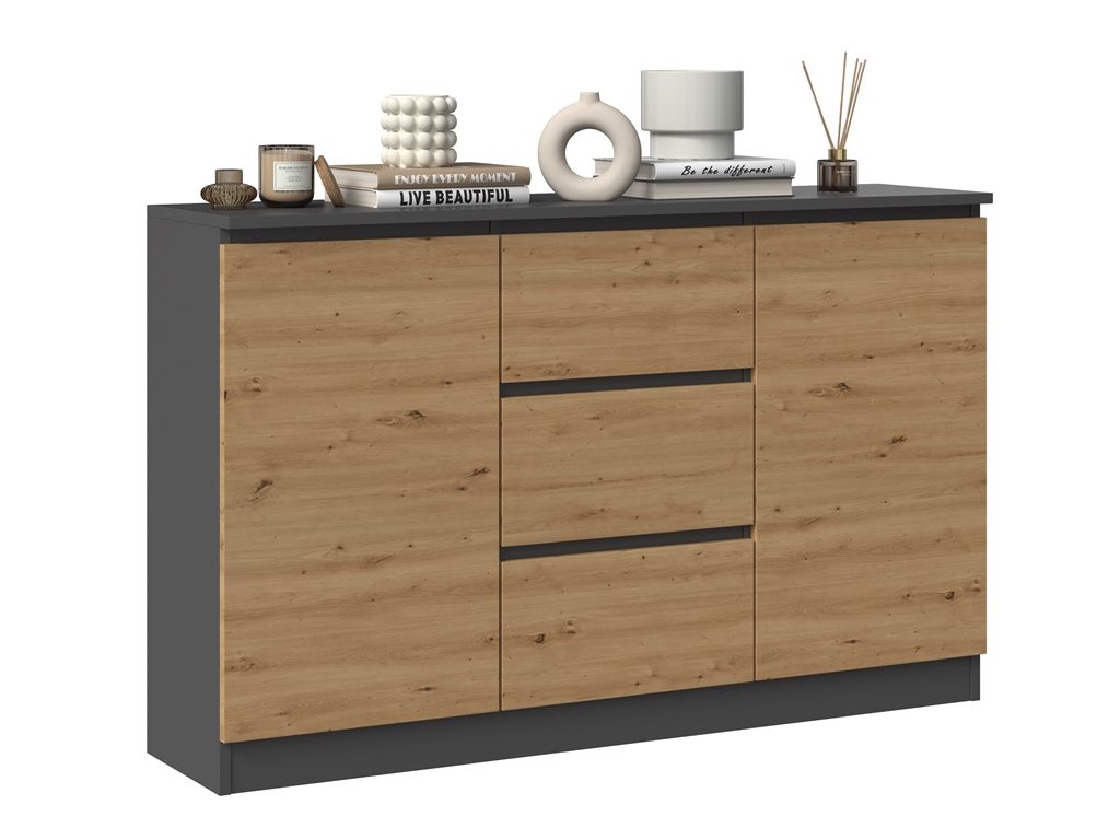 Moderní komoda 2D3S má dvoje dvířka a tři zásuvky, které Vám poskytnou dostatek úložného prostoru a hodí se do každého interiéru. Za dvířky se ještě nacházejí praktické police. Komoda má bezúchytové otevírání, takže vám nebudou do prostoru zasahovat žádné úchyty a zároveň to zdůrazňuje její moderní design. Vyrobena je z kvalitní laminové desky, která je nenáročná na údržbu a hrany jsou chráněny ABS páskou. Rozměry (ŠxVxH): 120 x 75 x 40 cm. >Barevné provedení : antracit/ dub artisan