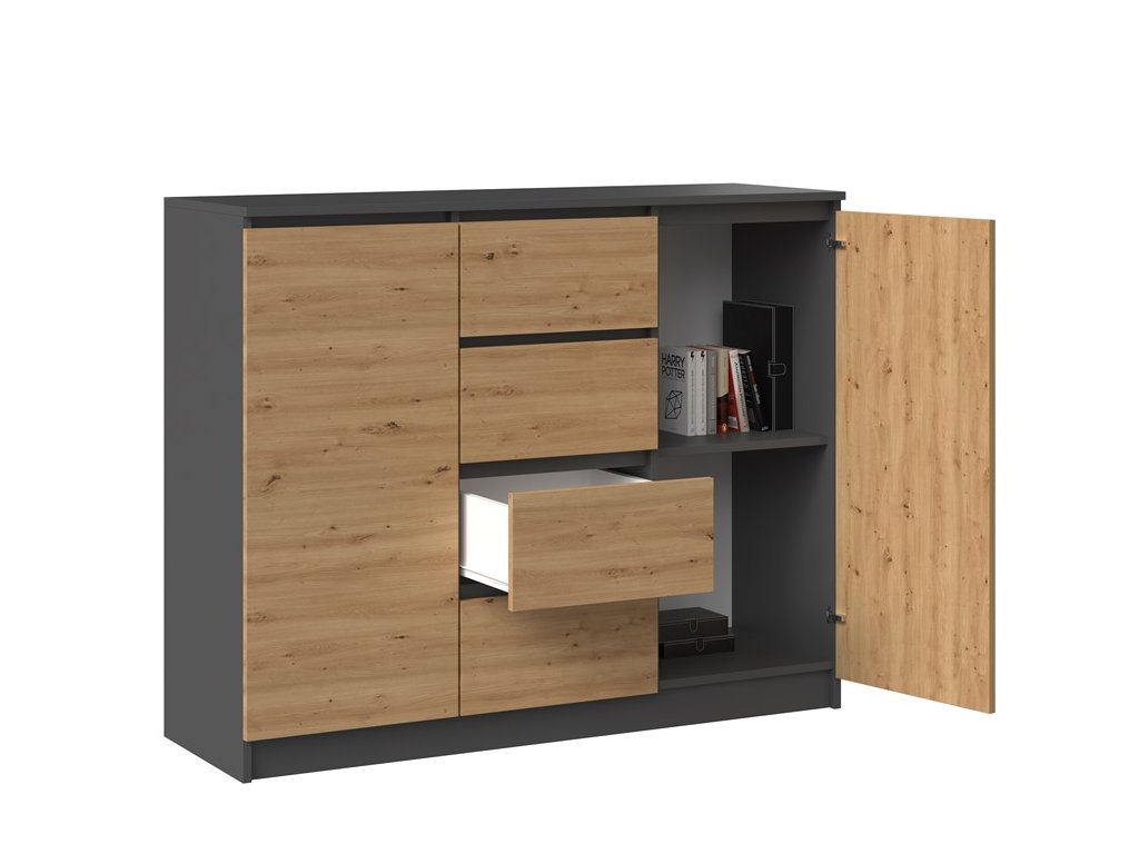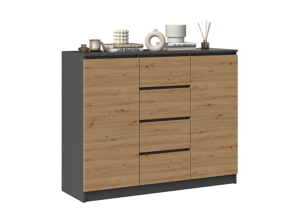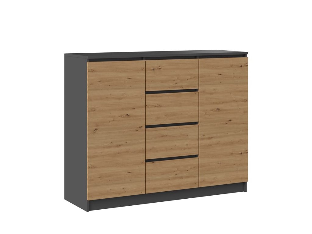 Moderní komoda 2D4S má dvoje dvířka a čtyři zásuvky, které Vám poskytnou dostatek úložného prostoru a hodí se do každého interiéru. Za dvířky se ještě nacházejí praktické police. Komoda má bezúchytové otevírání, takže vám nebudou do prostoru zasahovat žádné úchyty a zároveň to zdůrazňuje její moderní design. Vyrobena je z kvalitní laminové desky, která je nenáročná na údržbu a hrany jsou chráněny ABS páskou. Rozměry (ŠxVxH): 120 x 97 x 40 cm. >Barevné provedení : antracit/ dub artisan