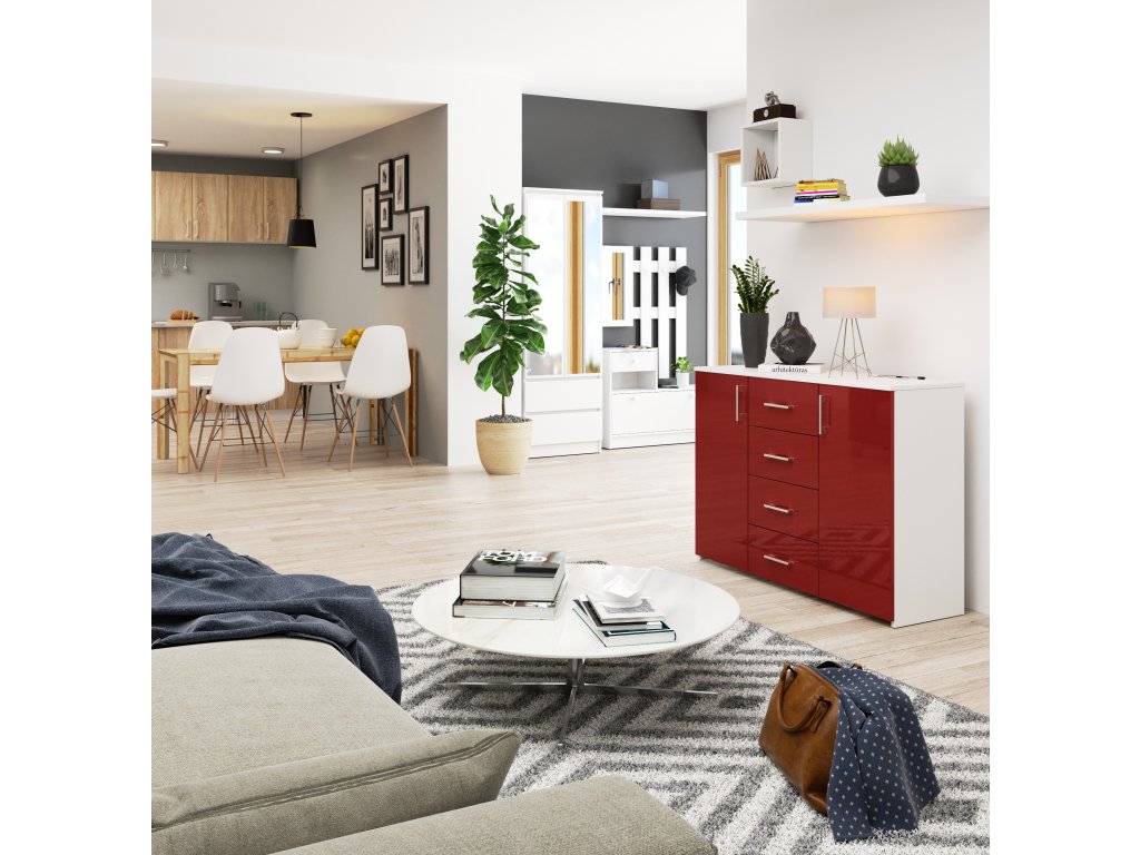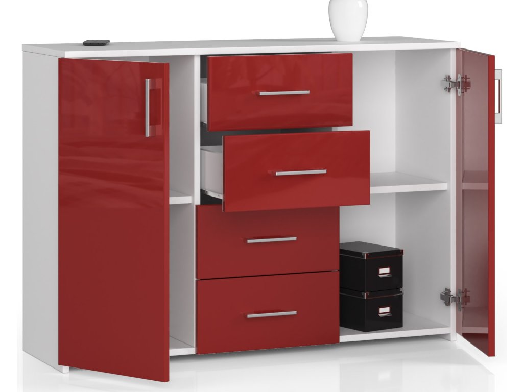 Barva a dekor: Kombinace bílé a červeného lesku dodává komodě jedinečný a elegantní vzhled.