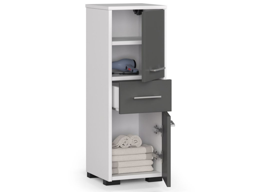 ASTRA2D skříňka nabízí kombinaci funkčnosti a estetiky. Tři police a praktická zásuvka umožňují uskladnění všech vašich koupelnových potřeb, zatímco kombinace bílé a grafitové barvy dodává prostoru sofistikovaný vzhled.