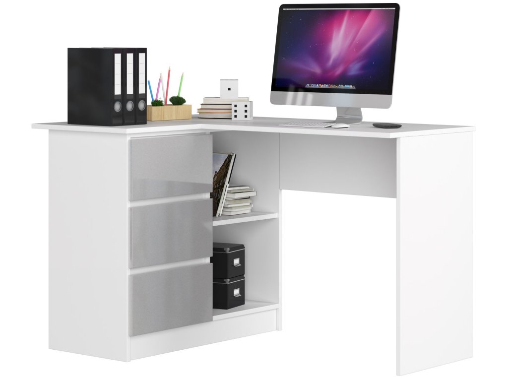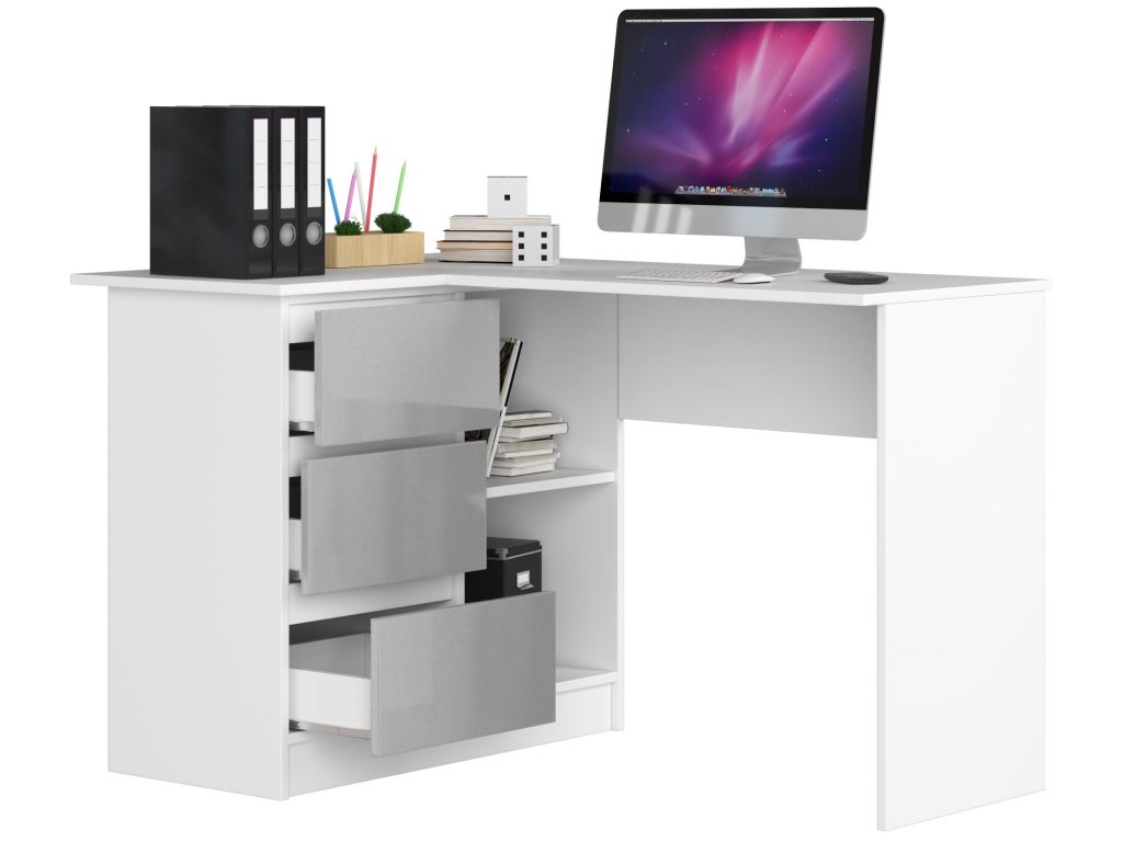 Moderní rohový psací stůl HERRA124L je ideální volbou pro každý dětský pokoj, kancelář či pracovnu. S jeho elegantní kombinací bílé barvy doplněné metalickým leskem přidáte do vašeho interiéru dotek sofistikovanosti a luxusu.