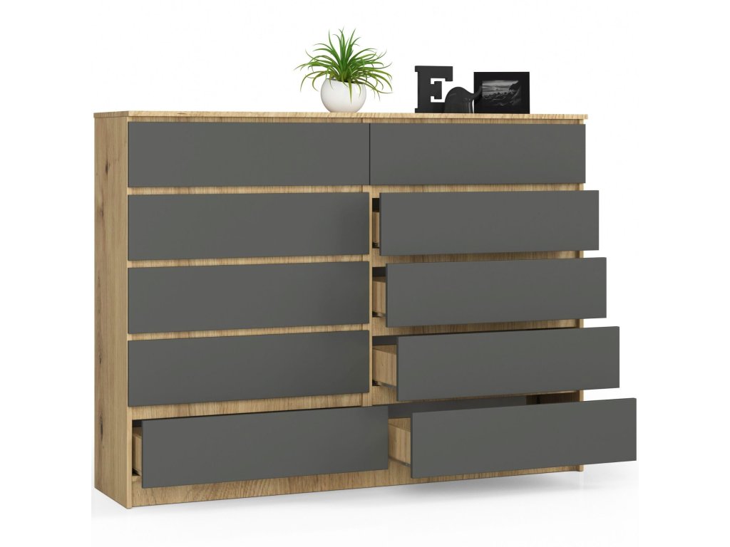 Navržená z vysoce kvalitního materiálu LTD, komoda překvapí nejen svou funkčností, ale také kombinací barev dub Artisan a grafit, která dodává nábytku jedinečný a luxusní vzhled.