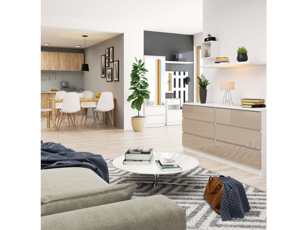 Vyrobená z kvalitního MDF, kombinuje bílou barvu s elegantním capuccino leskem, který zdůrazňuje její luxusní vzhled a lesklý dekor. Její široký design nabízí dostatek úložného prostoru pro vše, co potřebujete mít po ruce.