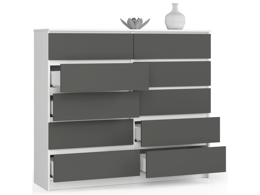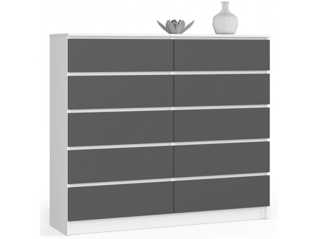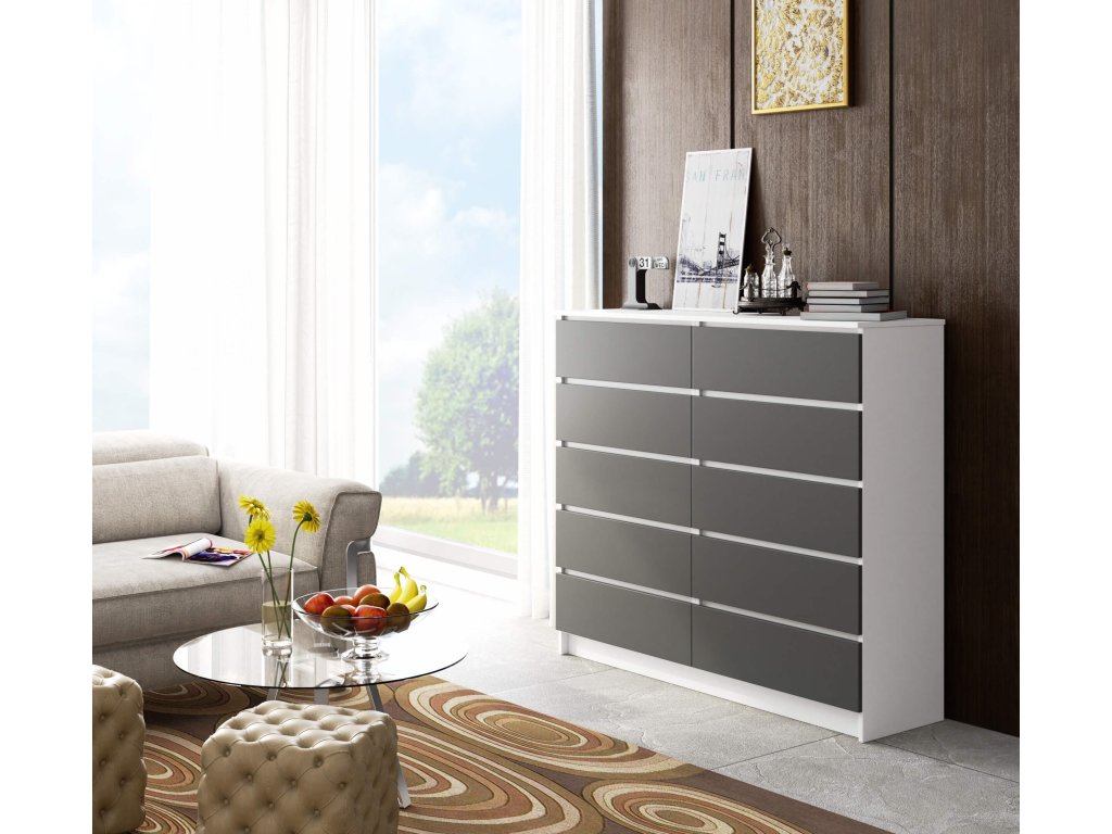 Komoda AGÁTA140 zaujme na první pohled svou kombinací bílé a grafitové barvy, která dodává produktu moderní a nadčasový vzhled. S šesti prostornými zásuvkami a dalšími úložnými prostory je ideálním řešením pro všechny, kteří hledají spojení krásy a funkčnosti. Ať už ji umístíte do ložnice či obývacího pokoje, vždy bude působit elegantně a vkusně. Obohaťte svůj domov o tento klenot moderního designu.
