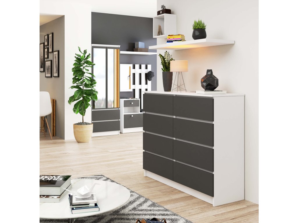 Oživte svůj interiér s JINDRA120, moderní komodou, která kombinuje čistotu bílé barvy s hloubkou grafitového odstínu. Tato vysoká skříňka je ideální pro ty, kteří hledají funkčnost spojenou s jedinečným designem.