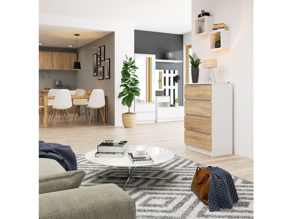 S kombinací čisté bílé a přírodního vzhledu dubu Sonoma je tato komoda vyrobena z vysoce kvalitního materiálu LTD. Její moderní a designový styl zdůrazňuje eleganci a současnost, zatímco čtyři prostorné zásuvky nabízejí dostatek úložného prostoru pro vaše potřeby.