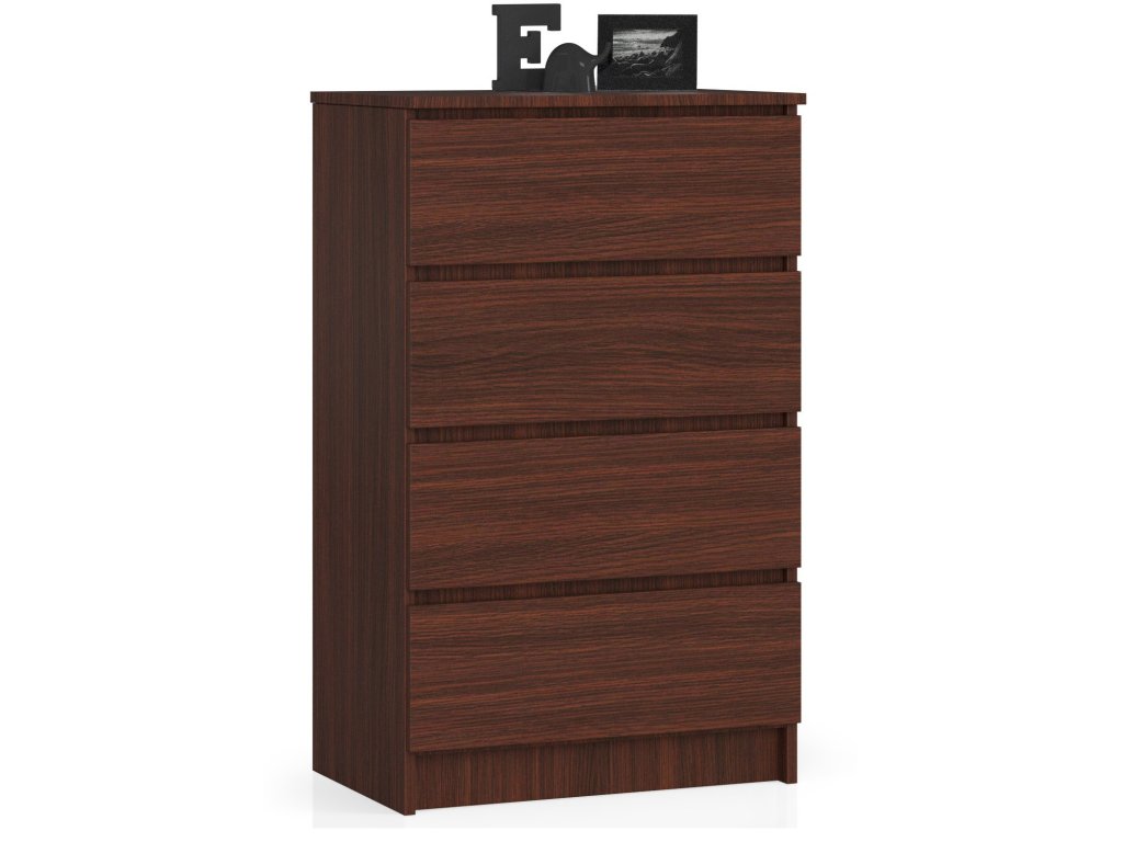 KRISS60 je moderní komoda s jedinečným designem, který vynikne v každém interiéru. Temný tón wenge dodává tomuto kousku nábytku luxusní a elegantní vzhled, díky čemuž se stane dominantním prvkem vaší ložnice či obývacího pokoje.