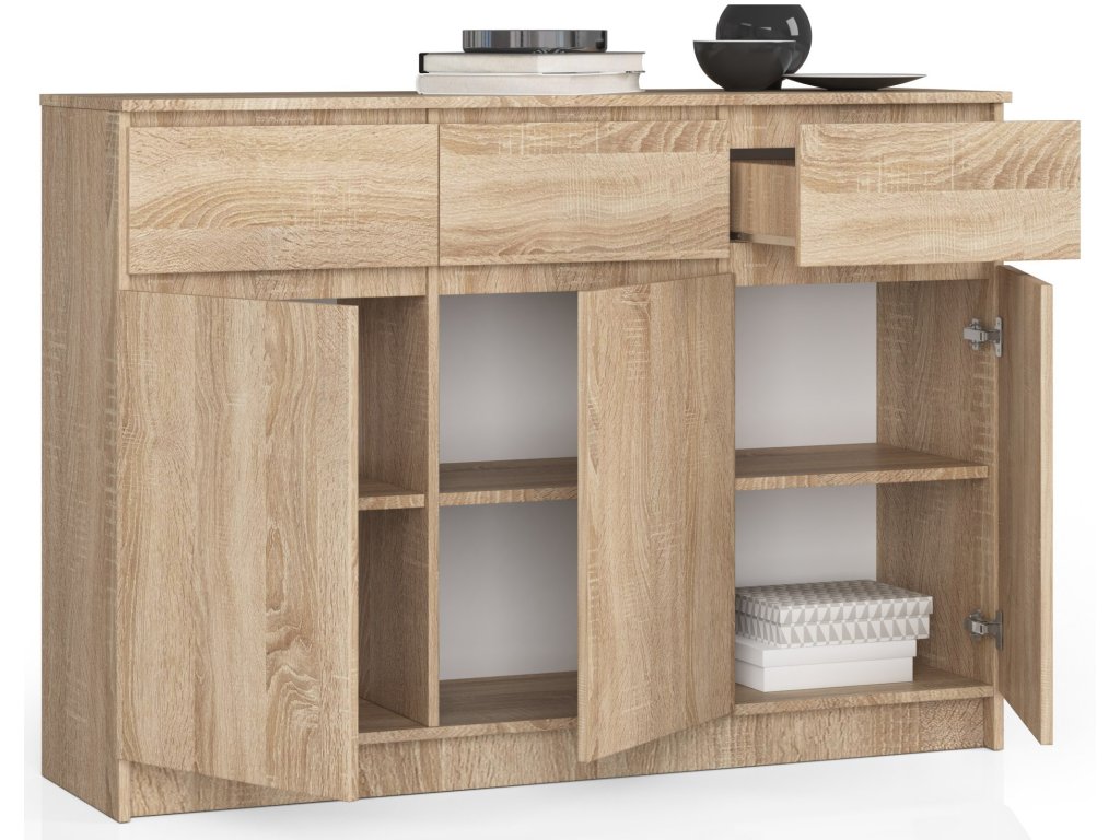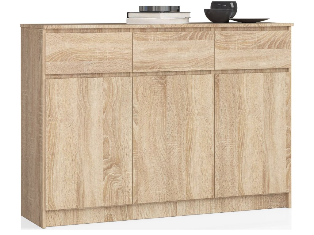 Moderní design komody LIANA140 s vysokým vzhledem a estetikou dubu Sonoma je skvělým doplňkem pro každý interiér. Navržená s důrazem na detail, tato komoda bude nádherným centrálním prvkem vašeho obývacího pokoje či ložnice.