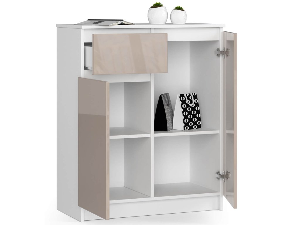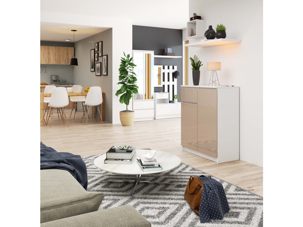 Díky modernímu stylu a lesklému dekoru v barvě capuccino se tato komoda stane centrálním prvkem vašeho obydlí. Ať už ji umístíte do ložnice nebo obývacího pokoje, vždy přidá dotek elegance a stylu. Praktická zásuvka a dvířka skrývají čtyři police, což poskytuje dostatek úložného prostoru pro vaše potřeby.