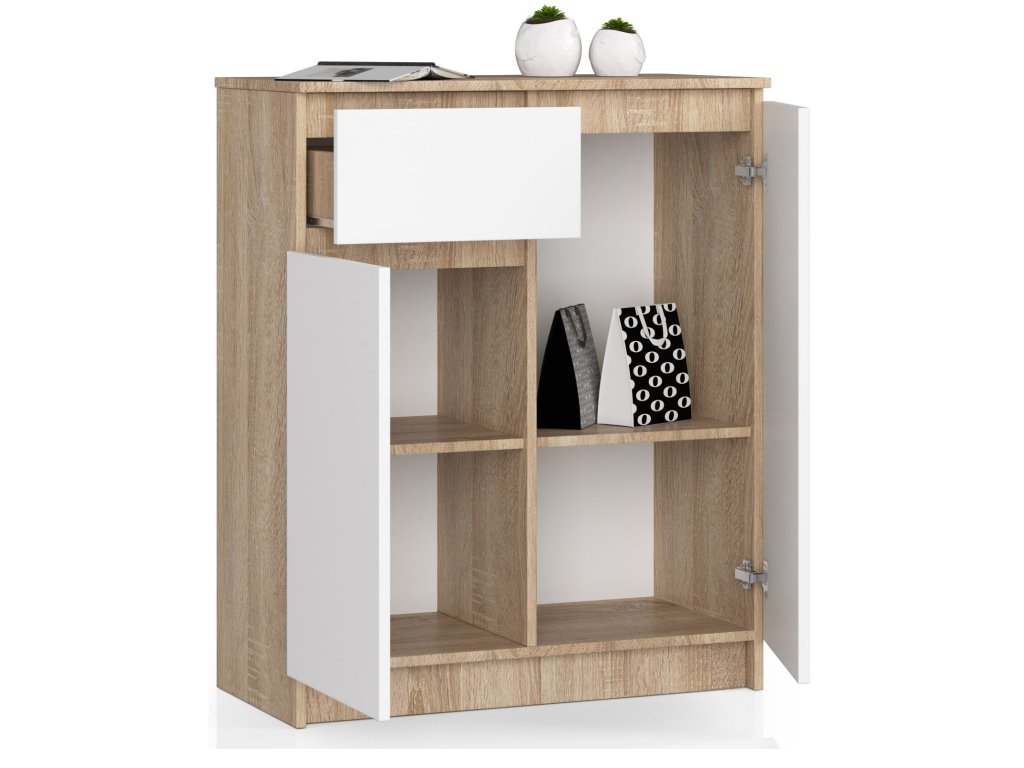 NIKOL80 v kombinaci dub Sonoma a bílá je ideální volbou pro ty, kteří hledají stylové a zároveň funkční úložné řešení pro svůj domov. Nechte se unést kouzlem této komody a obohaťte svůj interiér o skvost moderního designu.
