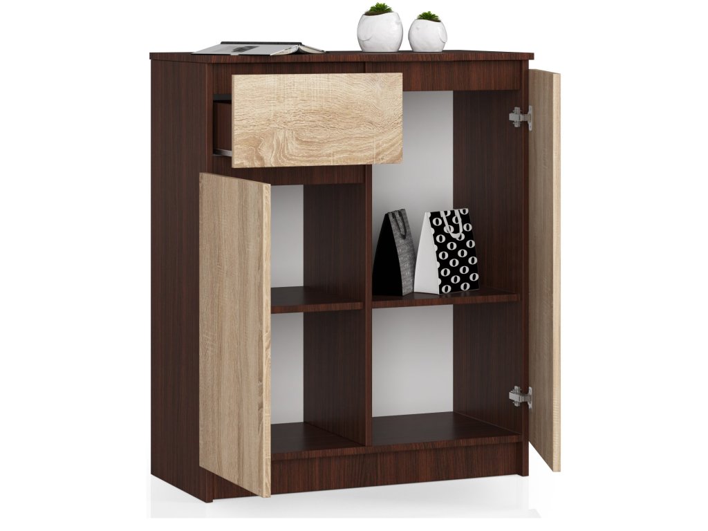Vynikající skříňka NIKOL80 přináší exkluzivní spojení temného wenge a teplého dubu Sonoma, což vytváří sofistikovanou a moderní atmosféru pro váš domov. Její designová elegace doplněná funkcionalitou je ideální pro každou ložnici či obývací pokoj.