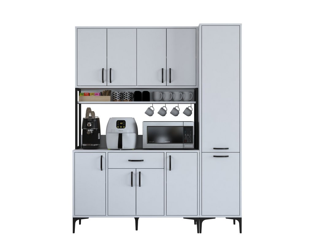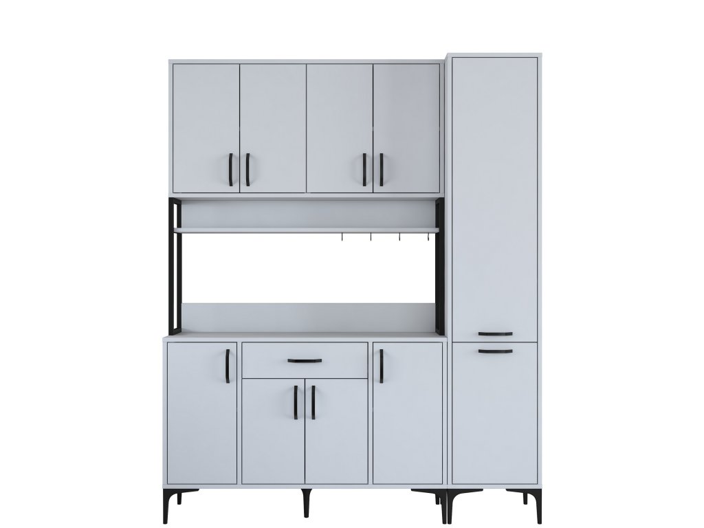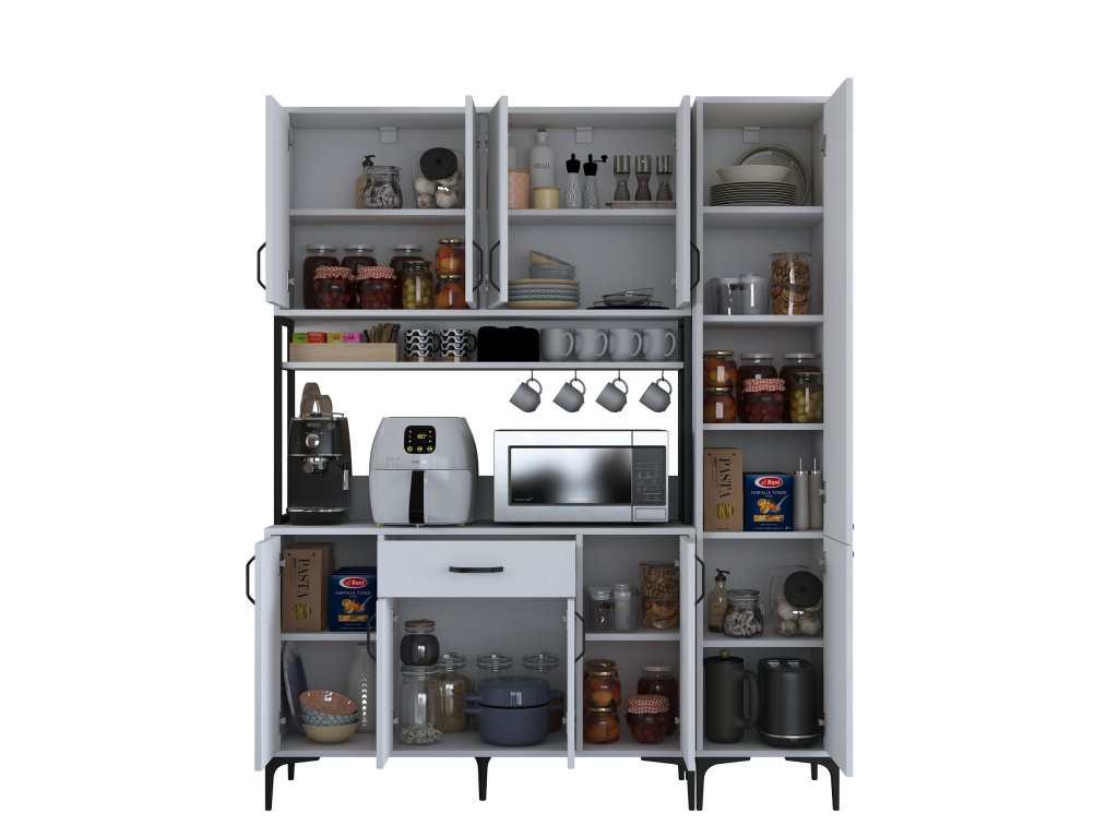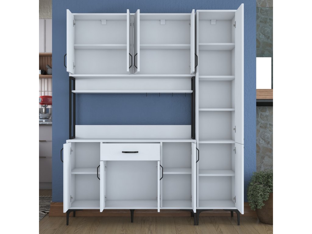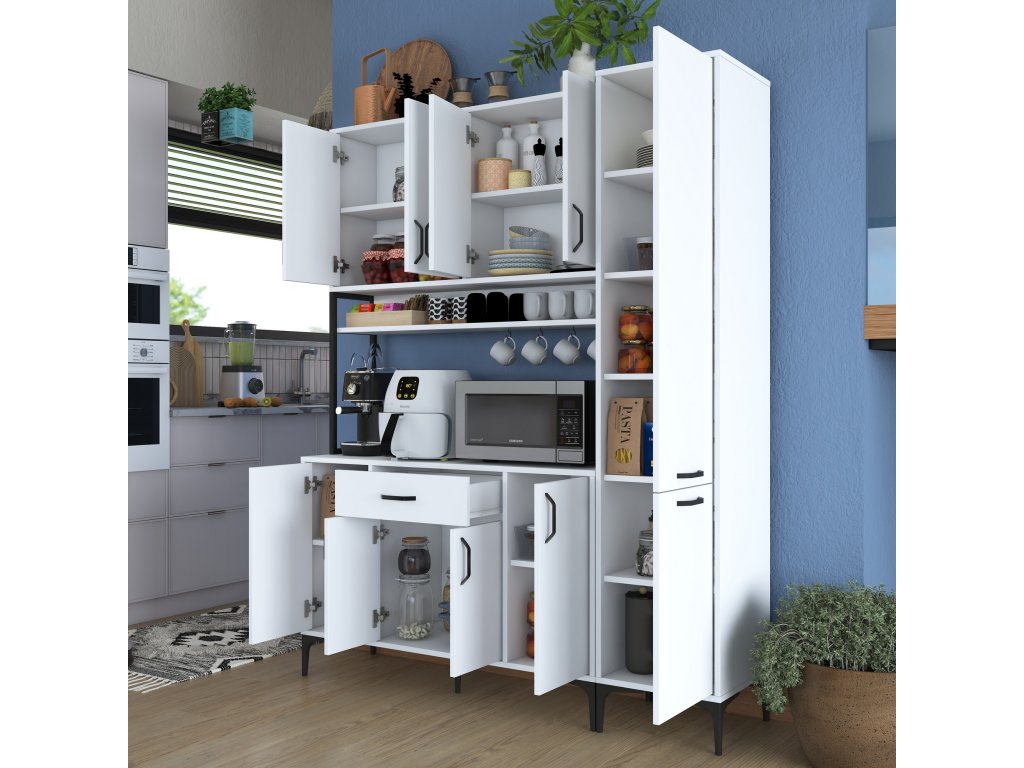 Skříň MORTY poskytuje bohatý úložný prostor díky 10 plným dvířkům, jedné zásuvce a praktickému regálku. Tento víceúčelový design umožňuje snadné uspořádání kuchyňských potřeb, nádobí a dalších předmětů, které chcete mít přehledně uložené a snadno dostupné.