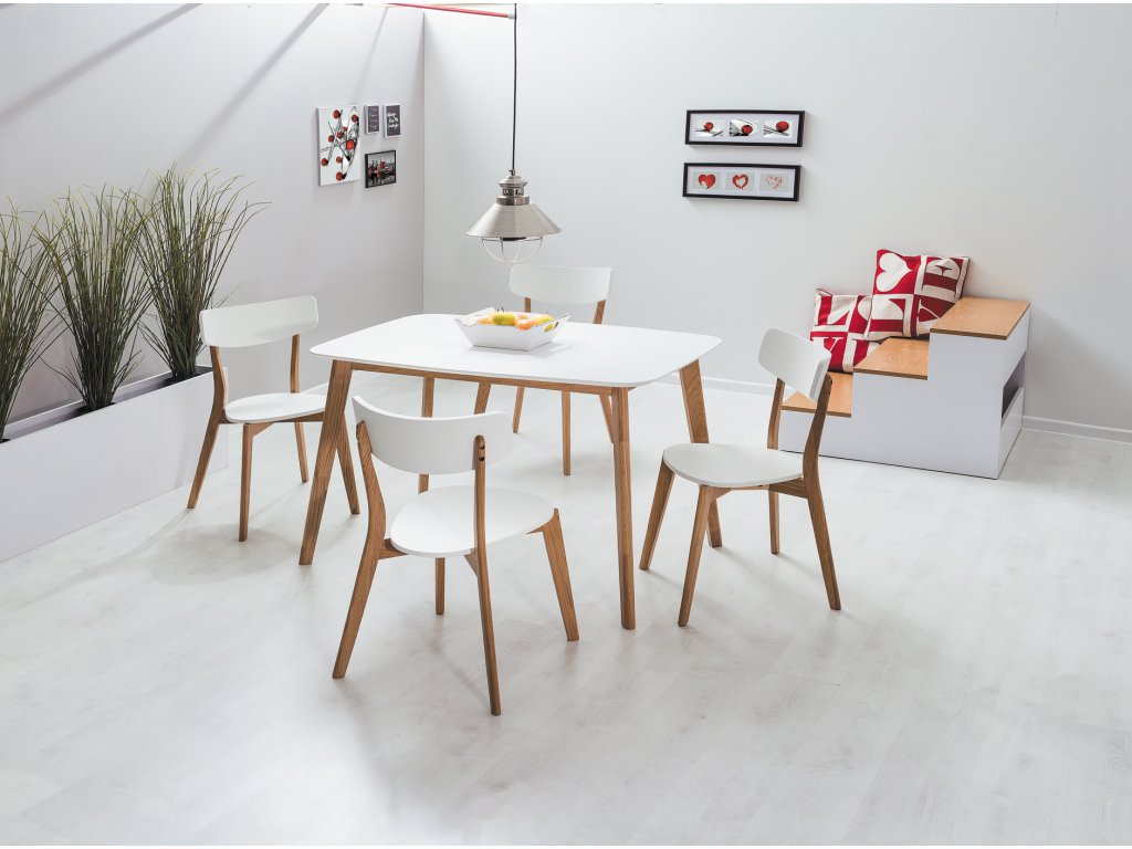 Jídelní stůl MOSO. Stylový jídelní stůl skandinávského stylu. Kombinace barev dub a bílá jsou vhodné do každého moderního interiéru a pro každého fanouška tohoto stylu. Stůl má velmi jednoduchý design, šikmé nožičky jsou typické pro tento sektorový nábytek. V tomto sektoru naleznete i další komody, regály, stolek i židle. Dodáváno v demontu. Rozměry (v/š/hv cm): 75/120/75Doplňkové parametry