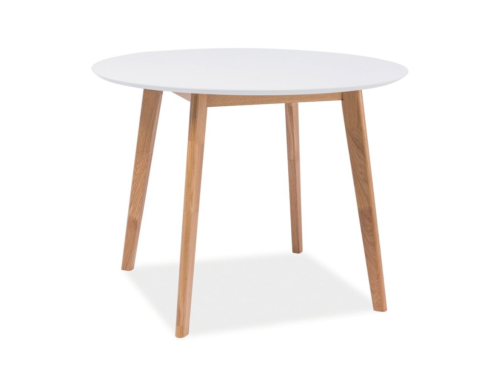 Kulatý jídelní stůl MOSO. Stylový jídelní stůl skandinávského stylu. Kombinace barev dub a bílá jsou vhodné do každého moderního interiéru a pro každého fanouška tohoto stylu. Stůl má velmi jednoduchý design, šikmé nožičky jsou typické pro tento sektorový nábytek. V tomto sektoru naleznete i další komody, regály, stůl i židle. Dodáváno v demontu. Rozměry (výška/průměr v cm): 75/100.