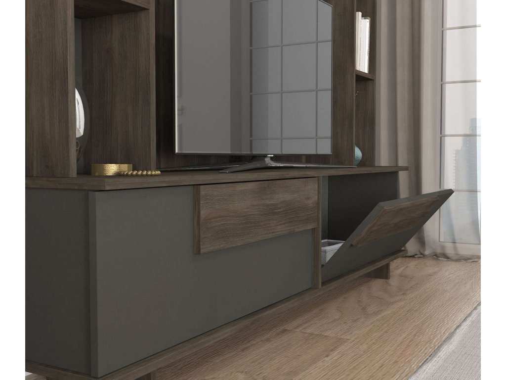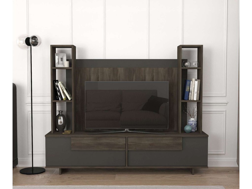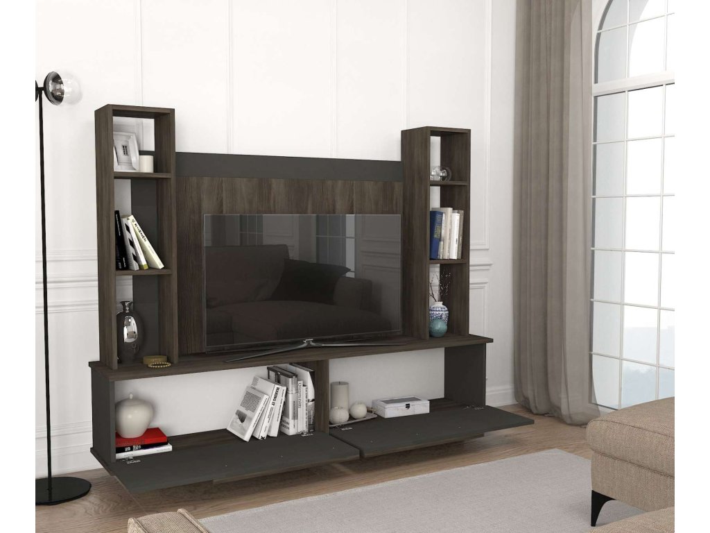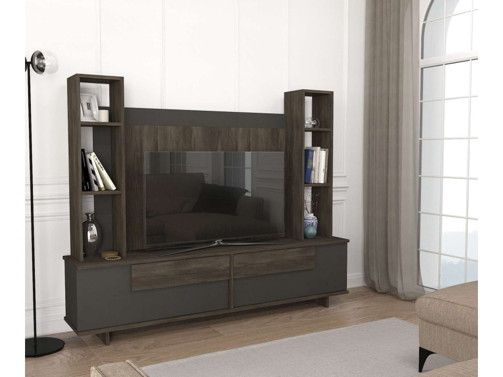 Seznamte se s MURDO, vysokým TV stolkem, který svým designem v tmavě hnědé a antracitové barvě přidává každému obývacímu pokoji elegantní a moderní vzhled. Tento robustní kus nábytku nabízí praktické úložné řešení díky svým dvěma plným dveřím a úzkému, ale vysokému profilu, který šetří prostor a zároveň poskytuje dostatek úložného prostoru.