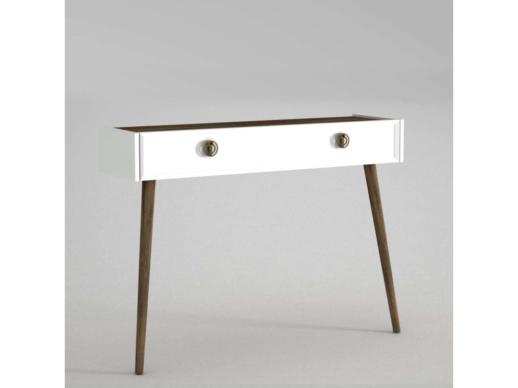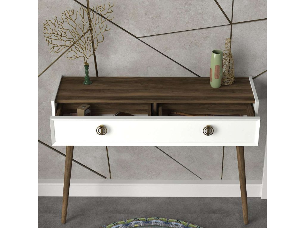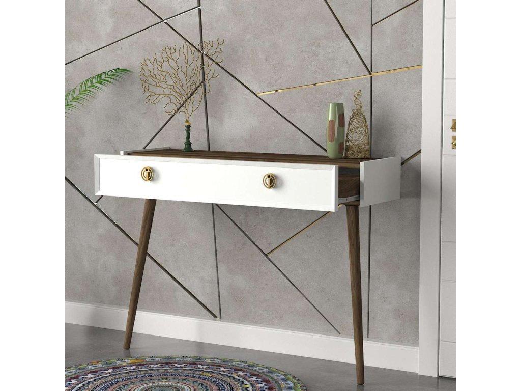 Konzolový stolek NADA se vyznačuje svou elegantní kombinací bílé barvy a ořechového dekoru, což přidává vašemu interiéru moderní a čistý vzhled. Praktická zásuvka poskytuje dostatek prostoru pro uložení vašich drobností, zatímco obdélníkový tvar stolu nabízí dostatek místa pro vystavení dekorací, knih nebo dalších předmětů.